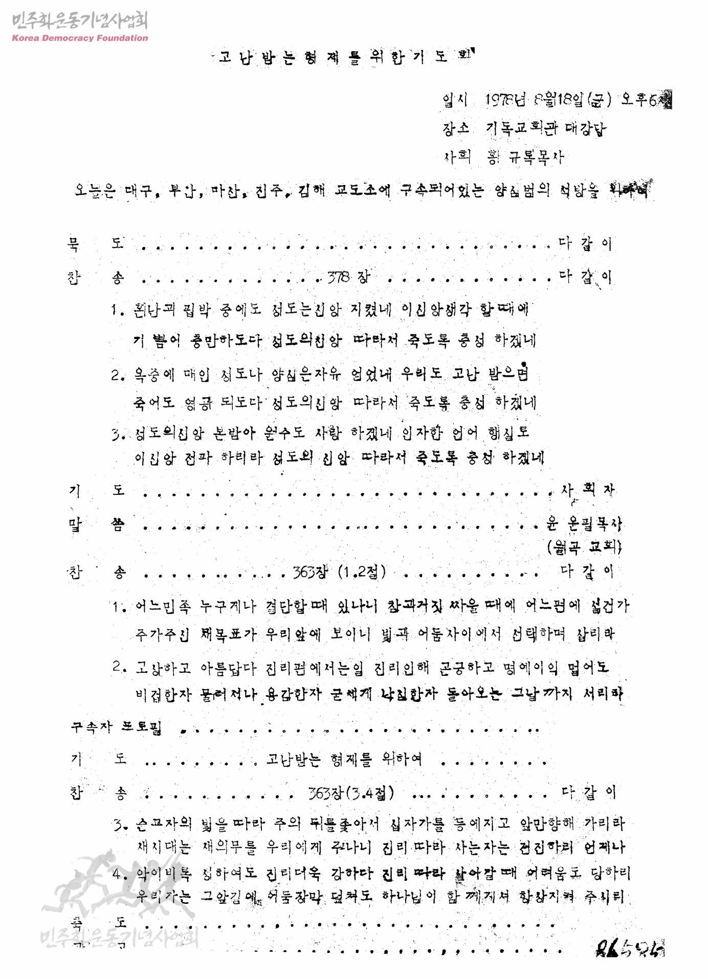 고난받는 형제를 위한 기도회-오늘은 대구, 부산, 마산, 진주, 김해 교도소에 구속되어 있는 양심범의 석방을 위하여