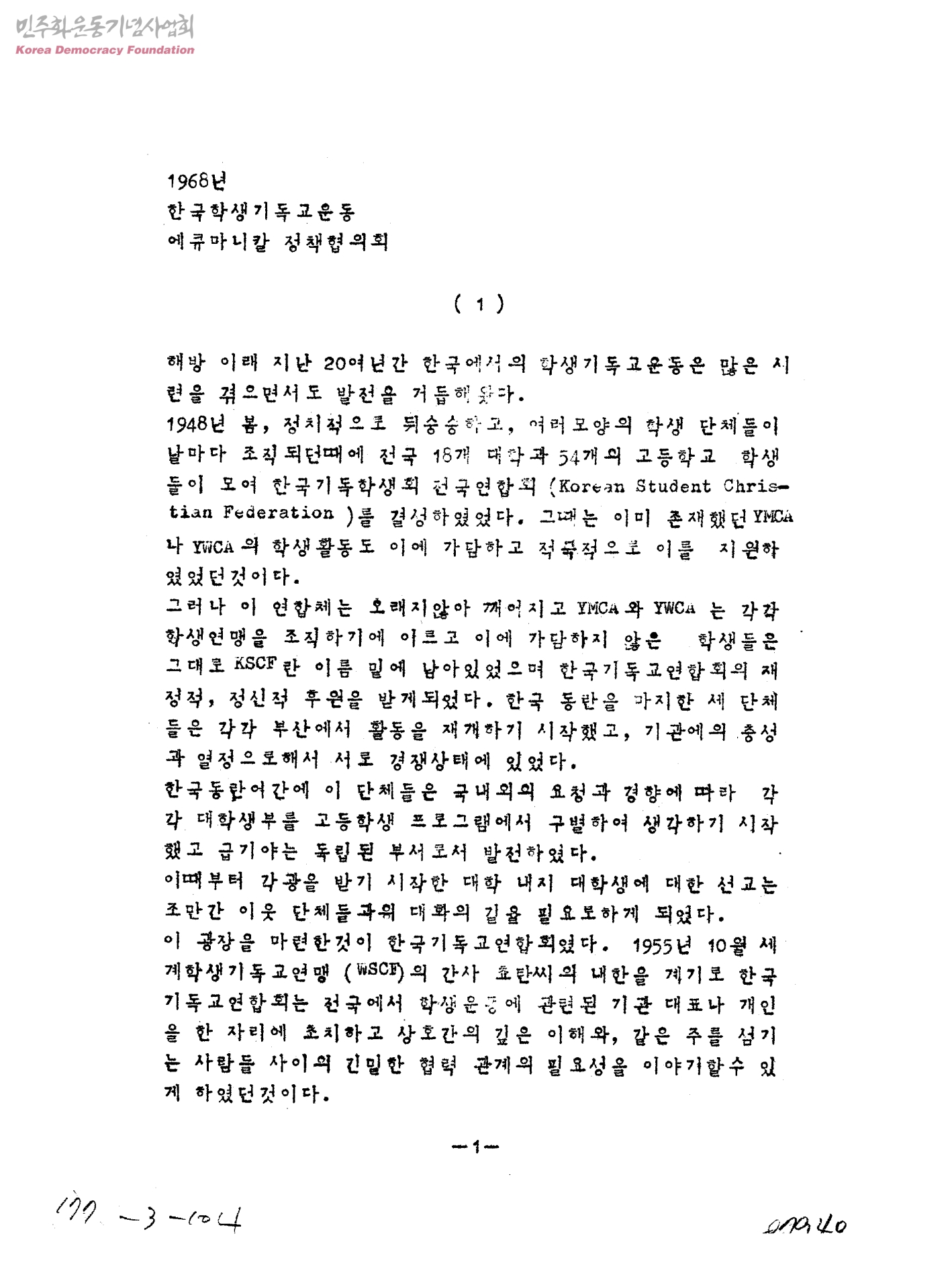[1968년 한국학생기독교운동 에큐메니칼 정책협의회에 관한 문서]