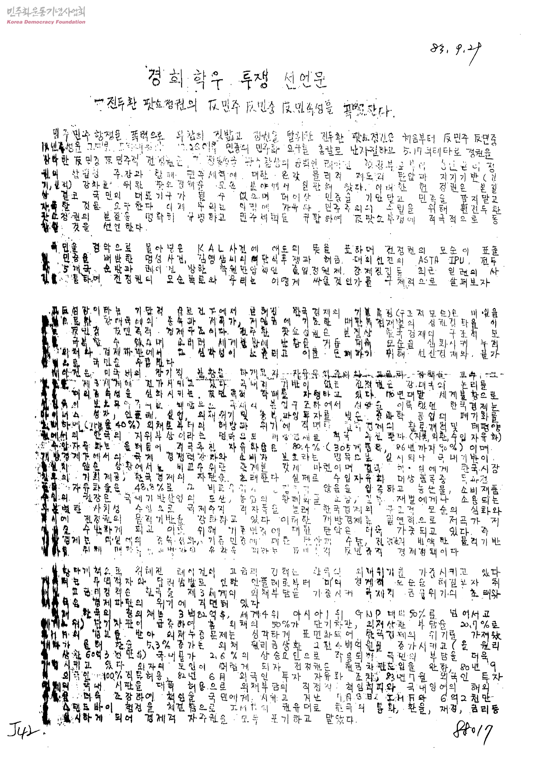 경희학우 투쟁 선언문-전두환 팟쇼정권의 反민주反민중反민족성을 고발한다.