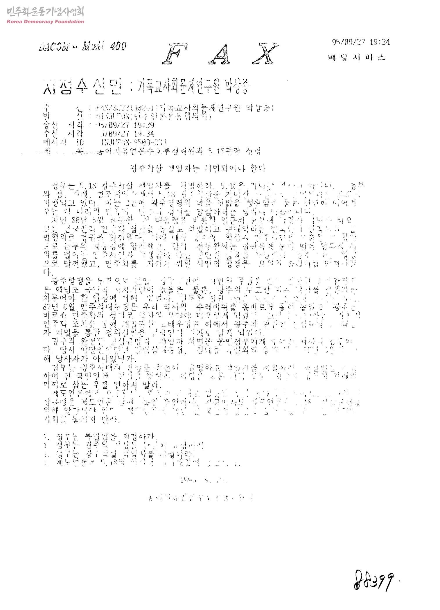 동아자유언론수호투쟁위원회 5.18관련 성명[수신:기독교사회문제연구원 박상종, 발신:동아자유언론수호투쟁위원회]