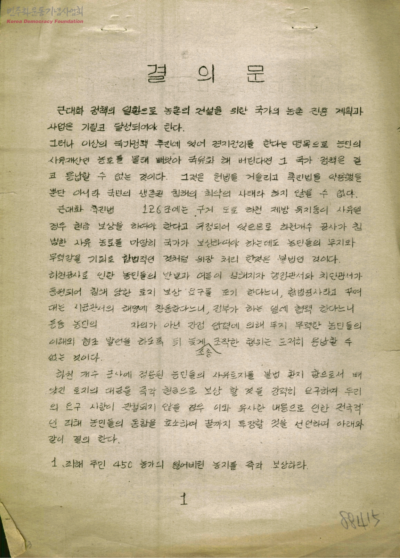 결의문[경지정리로 인한 피해 지구 농민들의 호소문]
