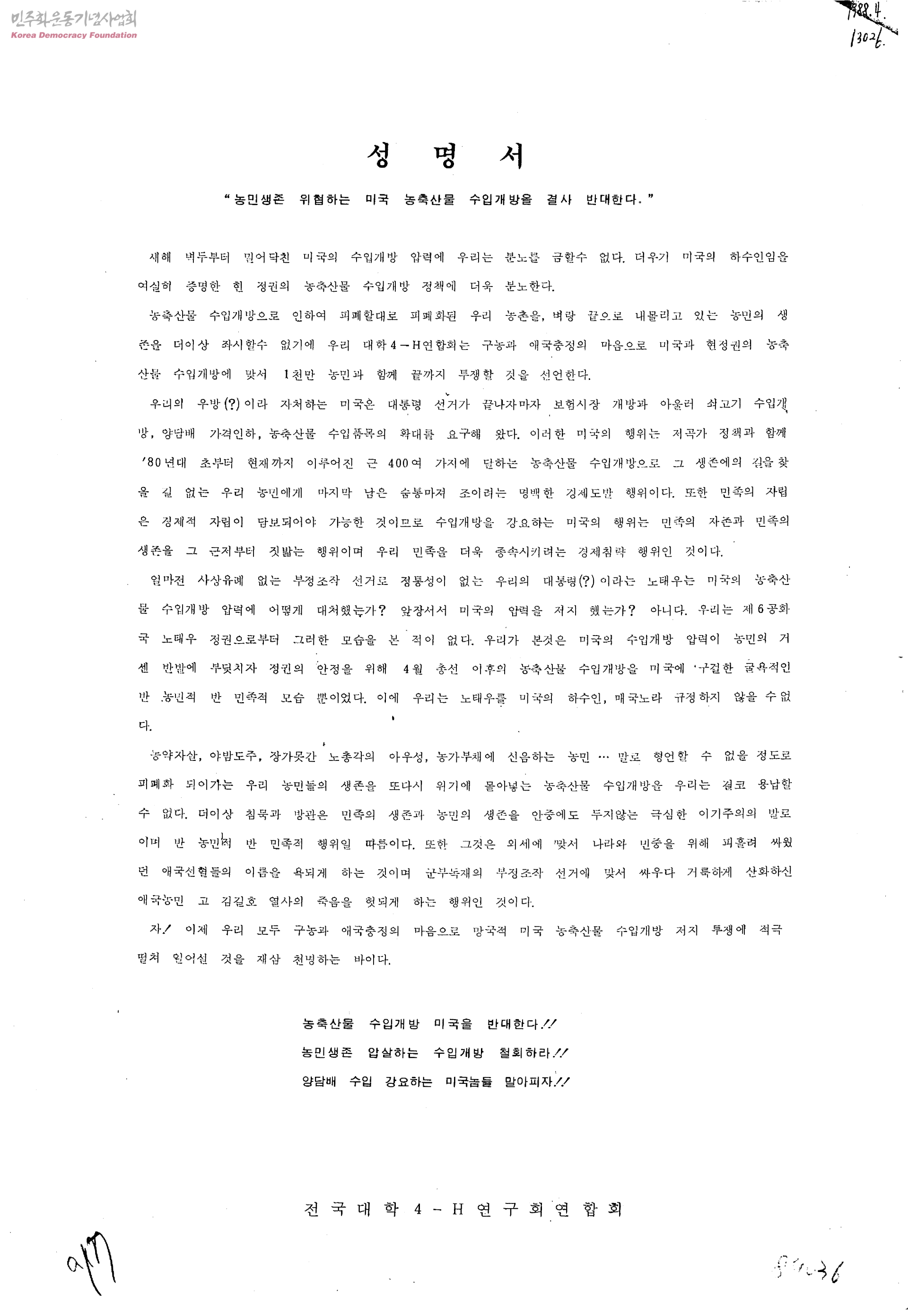 성명서-농민생존 위협하는 미국 농축산물 수입개방을 결사 반대한다.