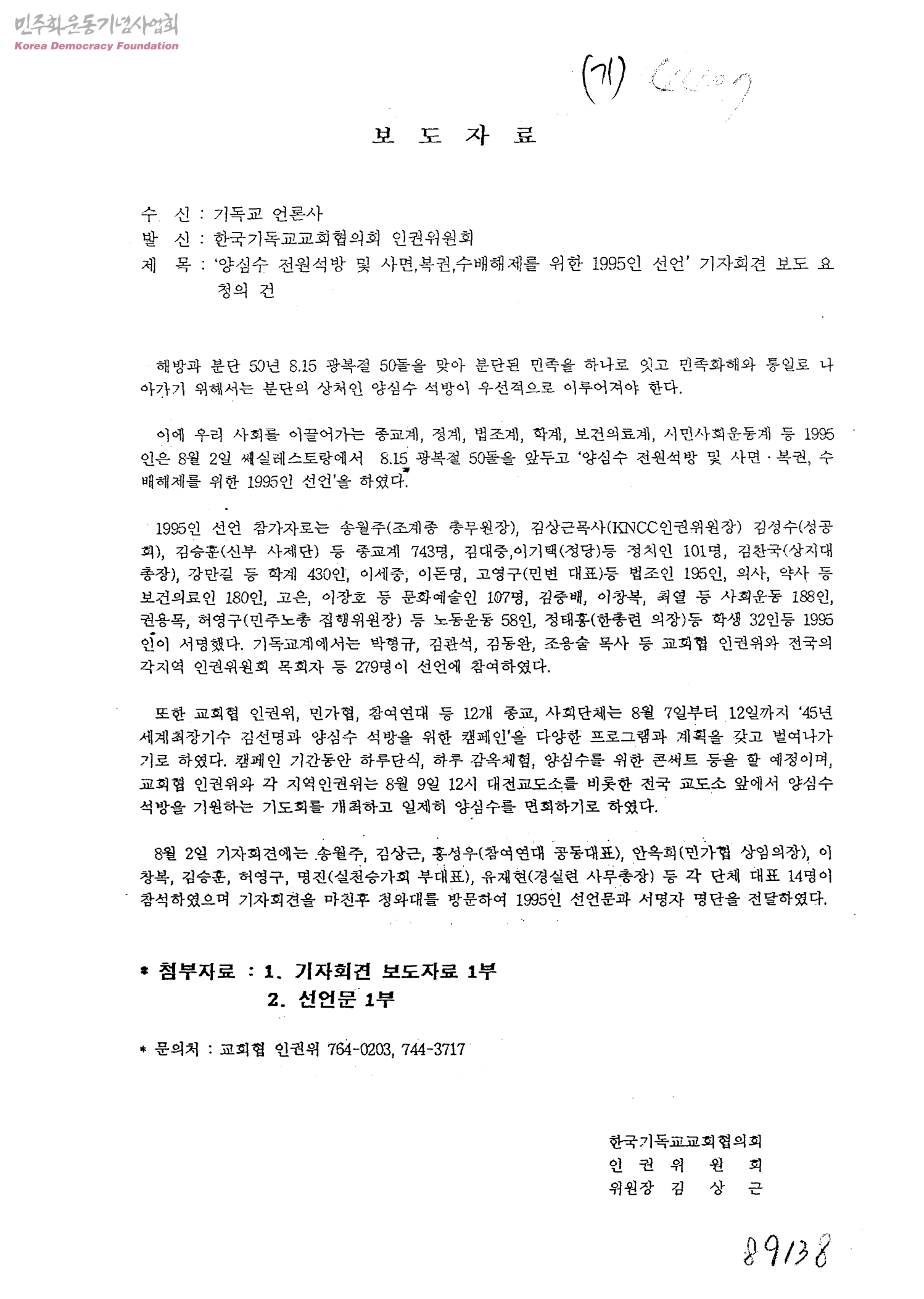 보도자료-'양심수 전원석방 및 사면, 복권, 수배해제를 위한 1995인 선언' 기자회견 보도 요청의 건[수신:기독교 언론사, 발신:한국기독교교회협의회 인권위원회]