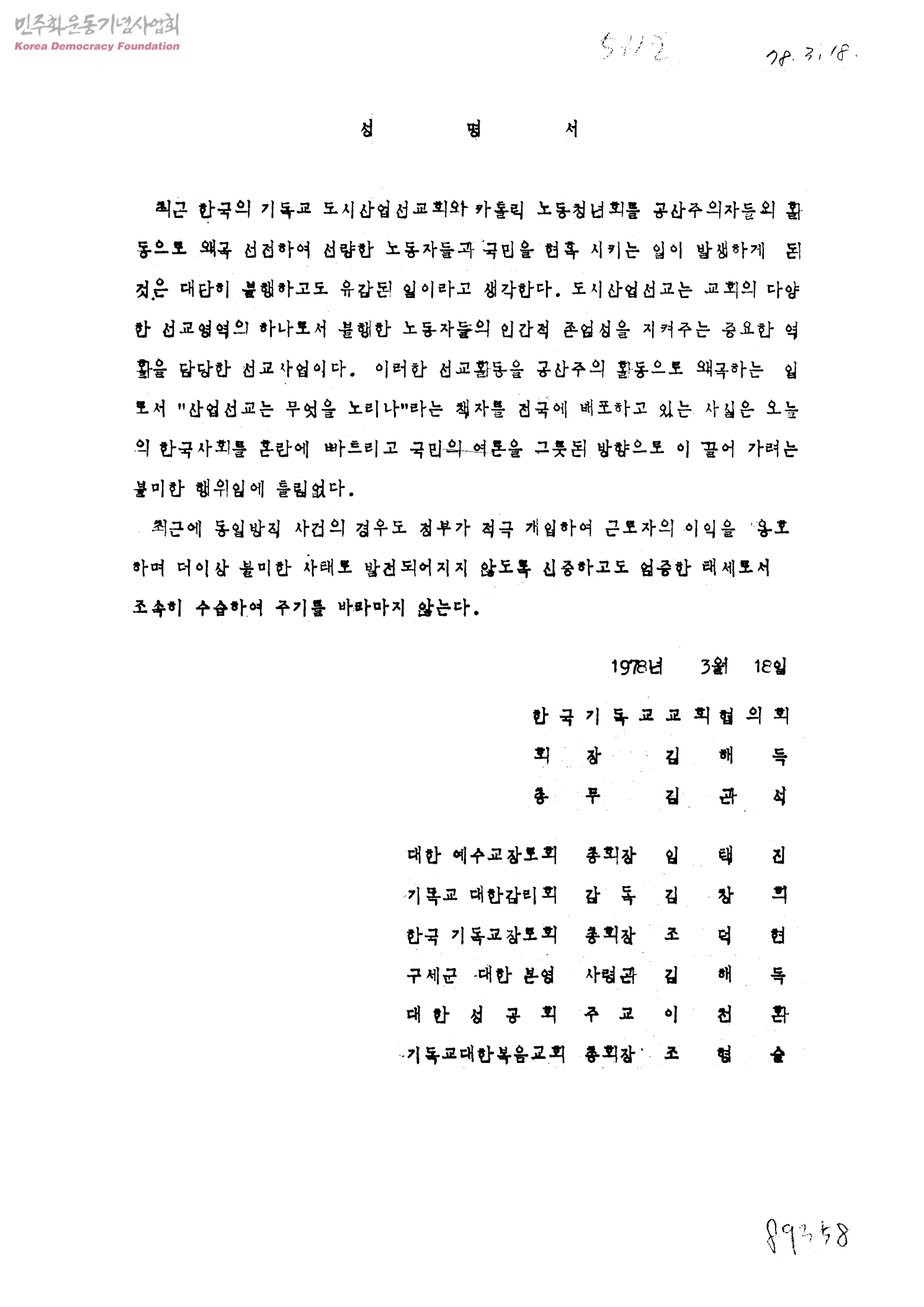 성명서[도시산업선교회와 카톨릭 노동청년회 왜곡 선전 관련]