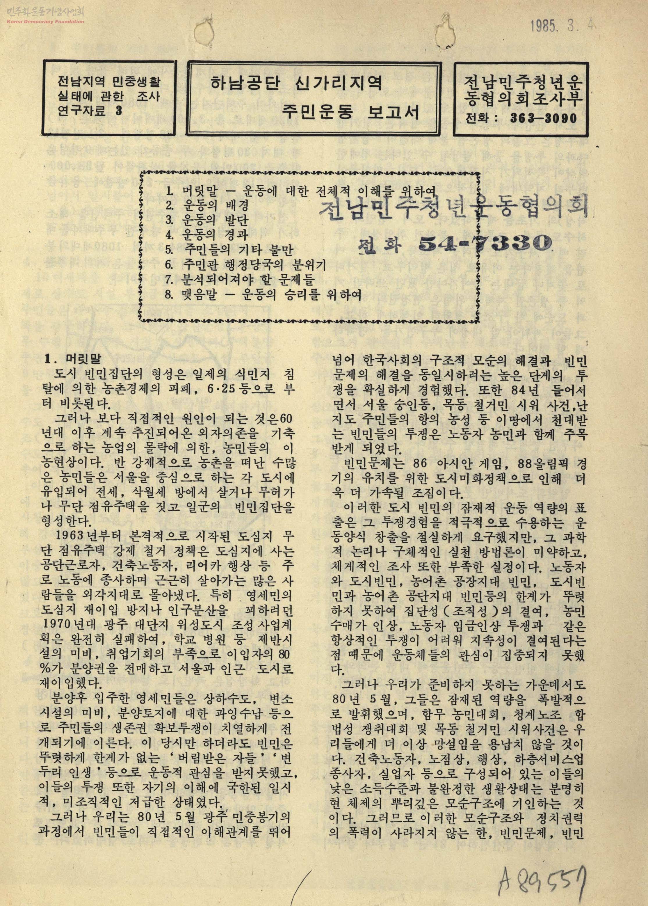 - 1. 머릿말-운동에 대한 전체적 이해를 위하여 2. 운동의 배경 3. 운동의 발단 4. 운동의 경과 5. 주민들의 기타 불만 6. 주민과 행정당국의 분위기 7. 분석되어져야 할 문제들 8. 맺음말-운동의 승리를 위하여