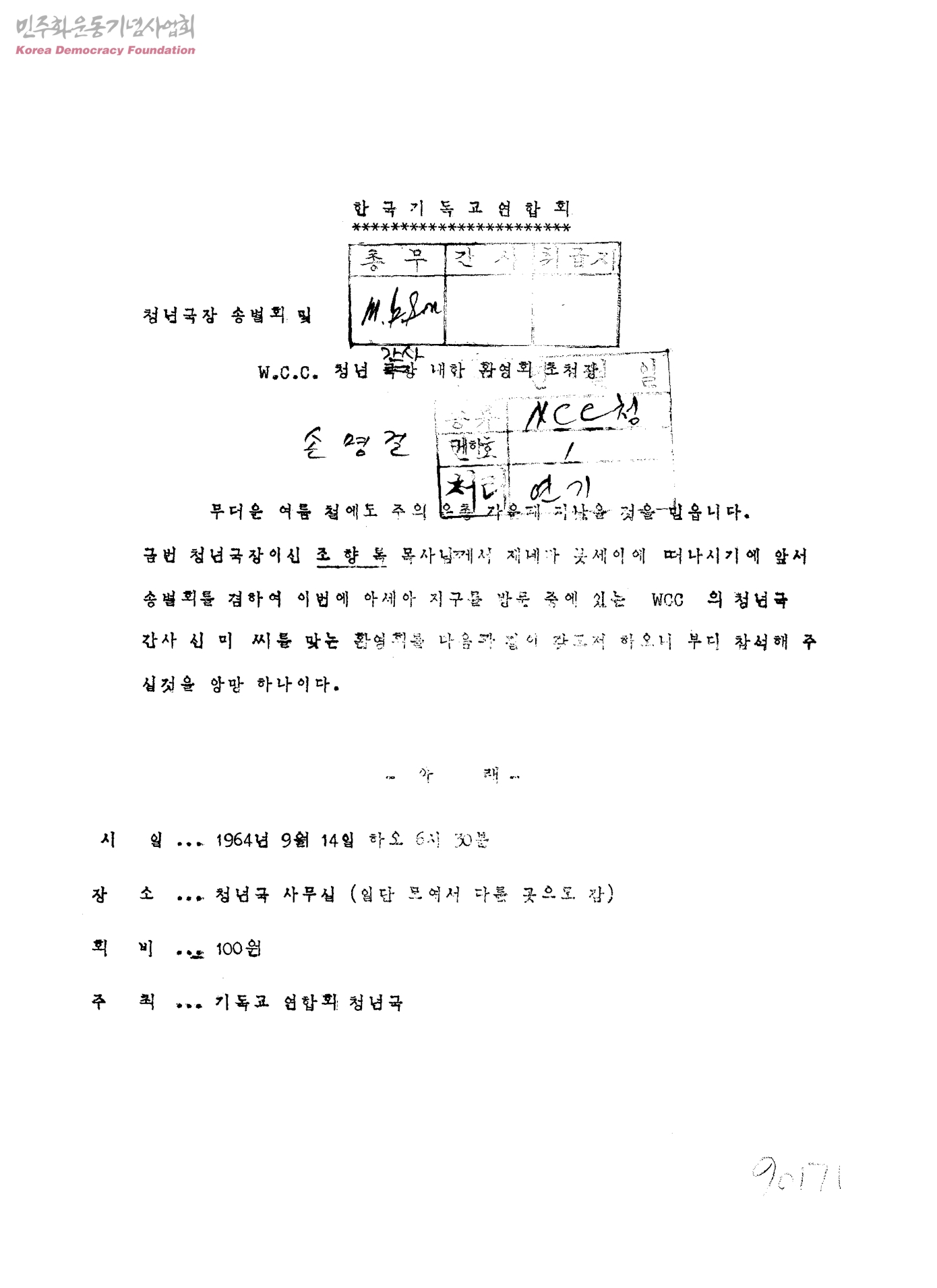 청년국장 송별회 및 W.C.C. 청년 간사 내한 환영회 초청장[손명걸에게 보내는 수신문서]