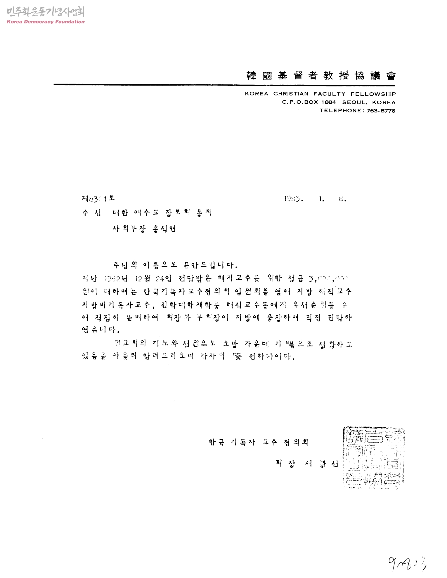 [한국기독교교수협의회가 대한예수교 장로회 총회 에게 보내는 해직교수 성금 전달해 줘다는 수발신 문서]