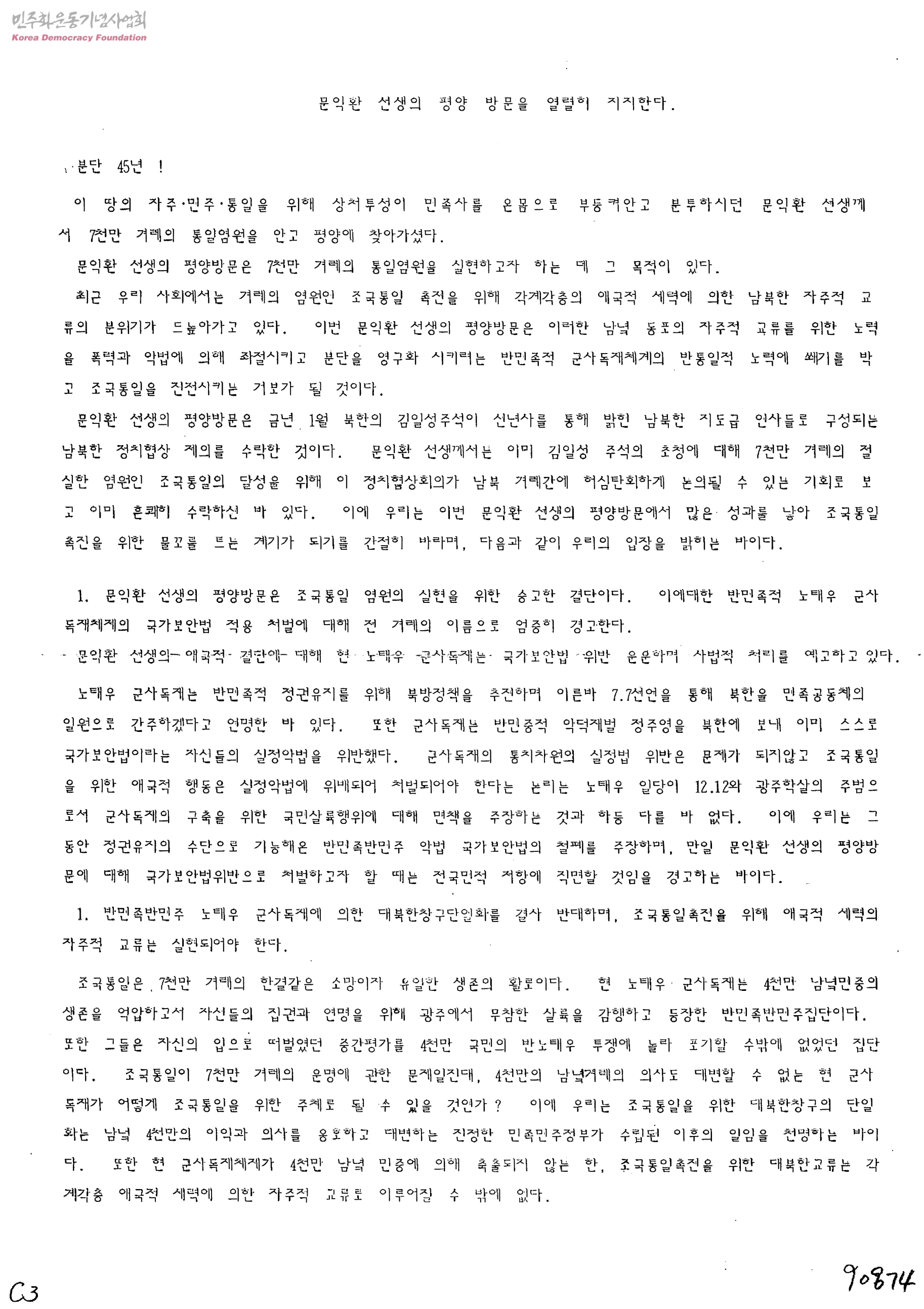 문익환 선생의 평양 방문을 열렬히 지지한다