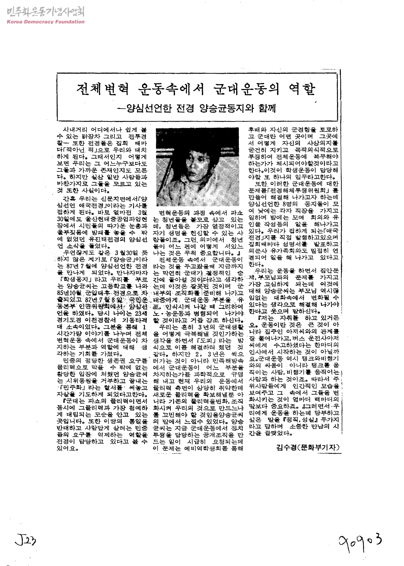 [신문스크랩]전체변혁 운동속에서 군대운동의 역할-양심선언한 전경 양승균동지와 함께