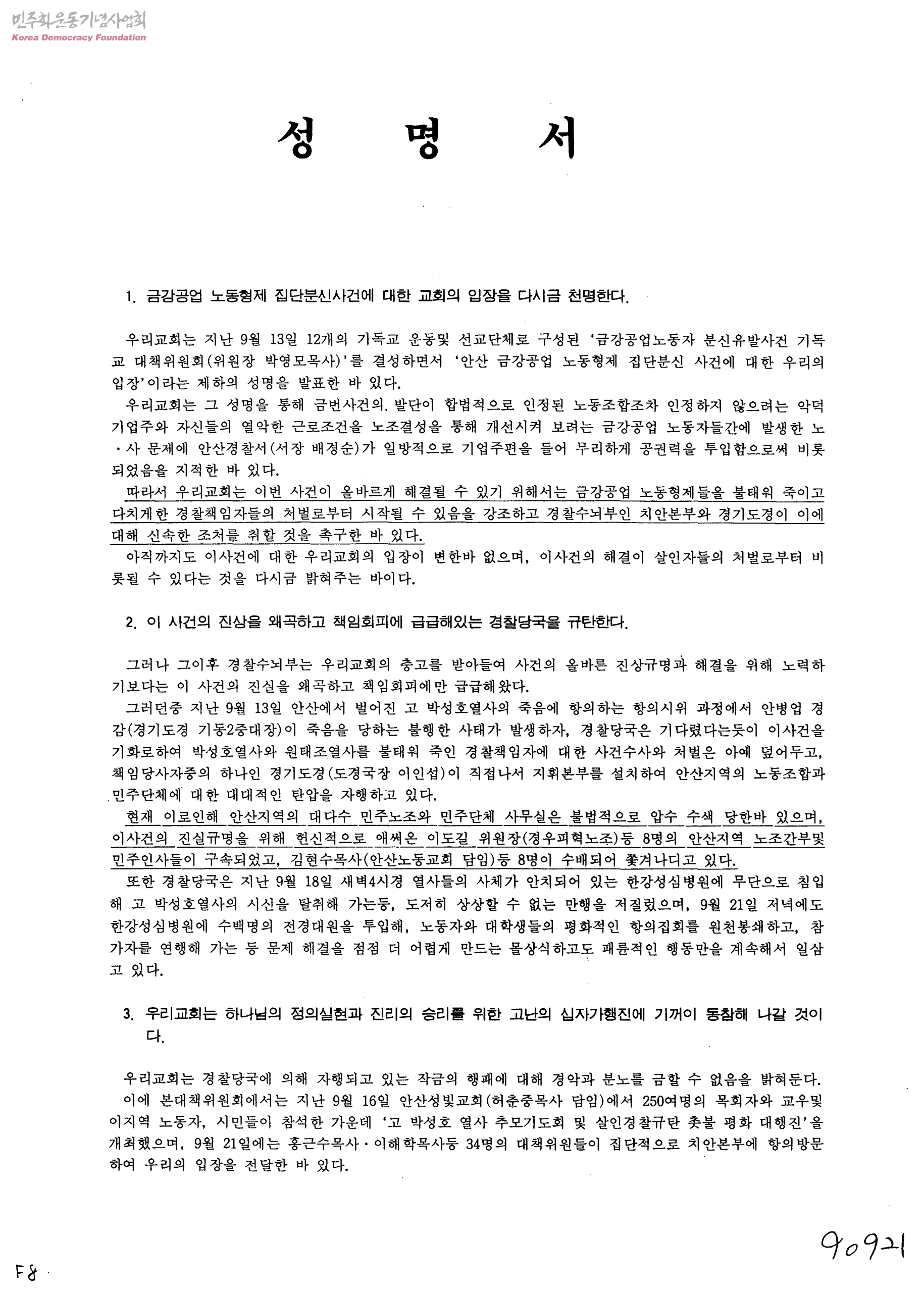 성명서[금강공업노동자의 분신사건에 대한 내용]