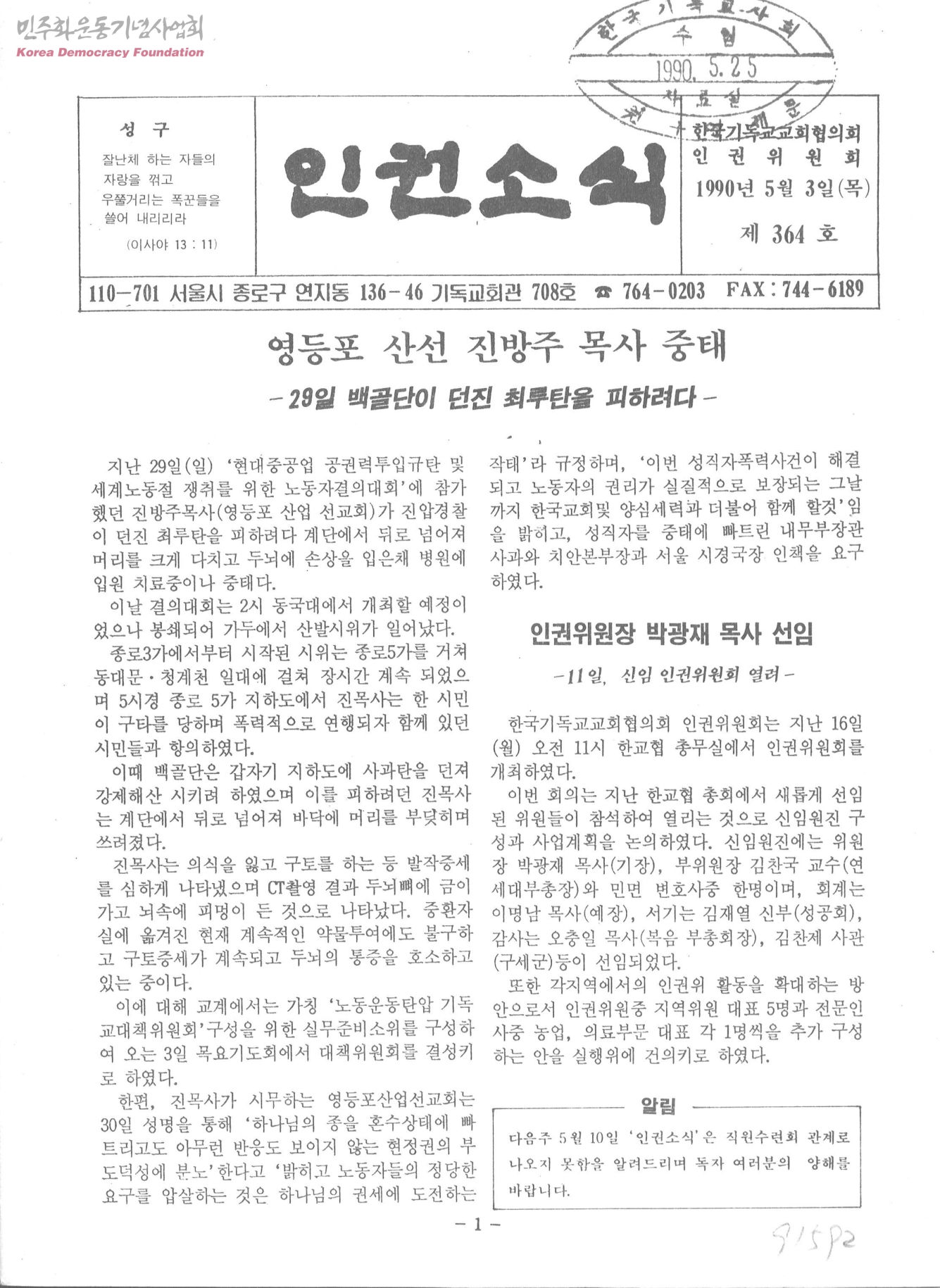 - 영등포 산선 진방주 목사 중태-29일 백골단이 던진 최루탄을 피하려다 재일동포의 확실한 법적지위보장 쟁취로 굴욕적 역사 과감히 벗어나야-대통령 방일에 즈음한 재일동포 법적지위 보장 재촉구 명신여고 학원분규 진단 무주택 서민, 일가족 4명 동반자살