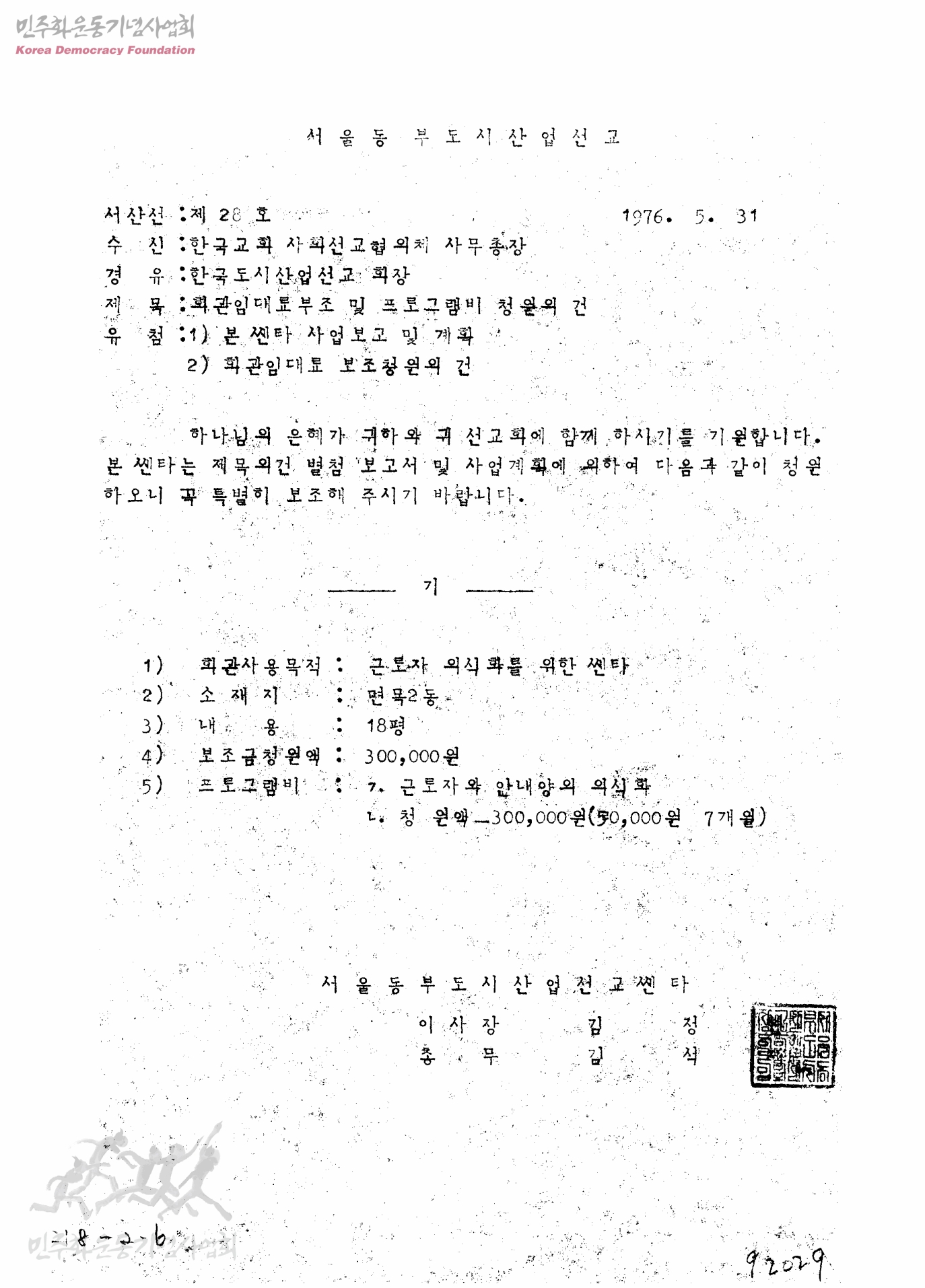 회관임대료부조 및 프로그램비 청원의 건[수신:한국교회사회선교협의체사무총장]