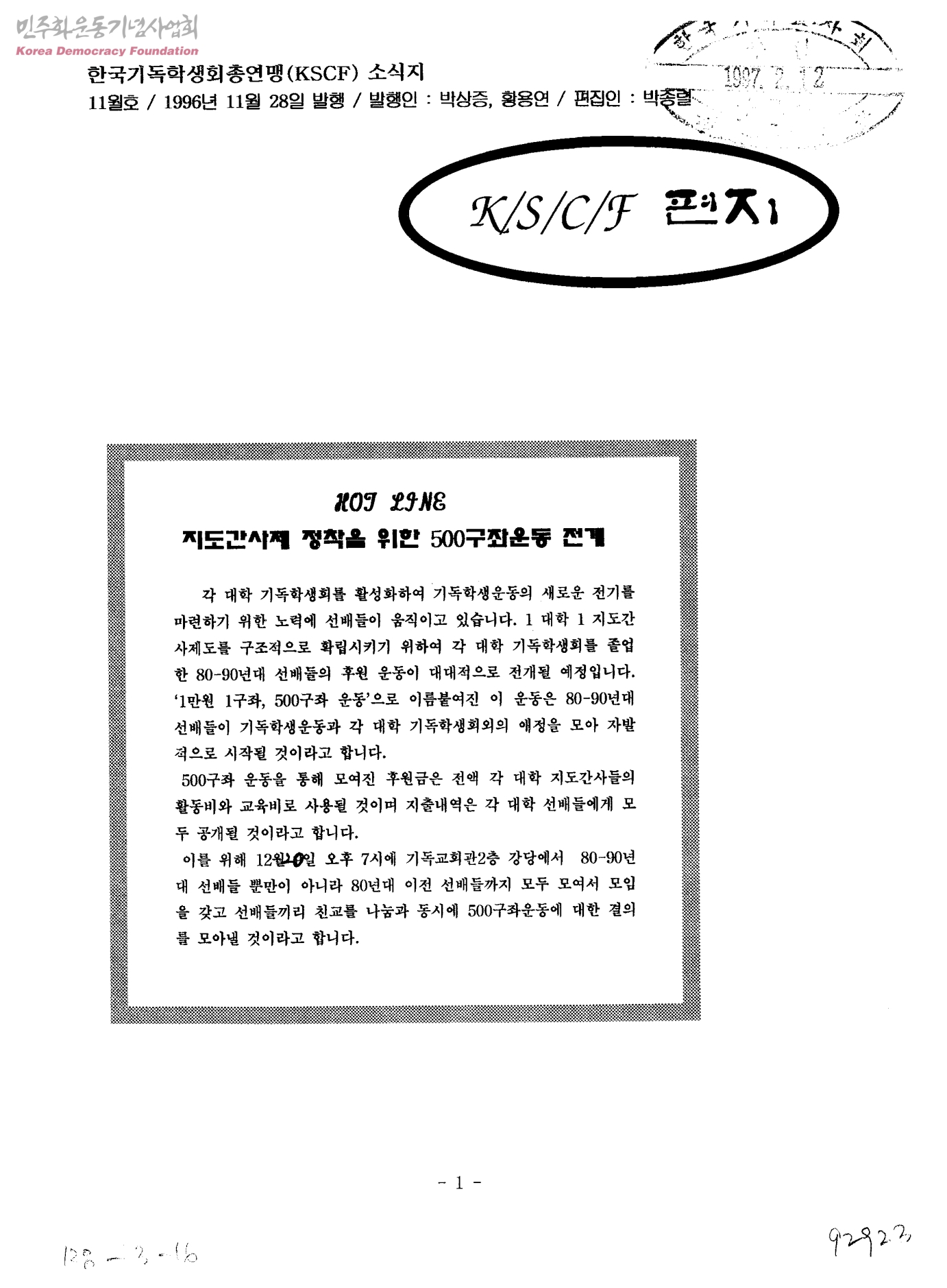 한국기독학생회총연맹(KSCF)소식지 11월호 K/S/C/F 편지