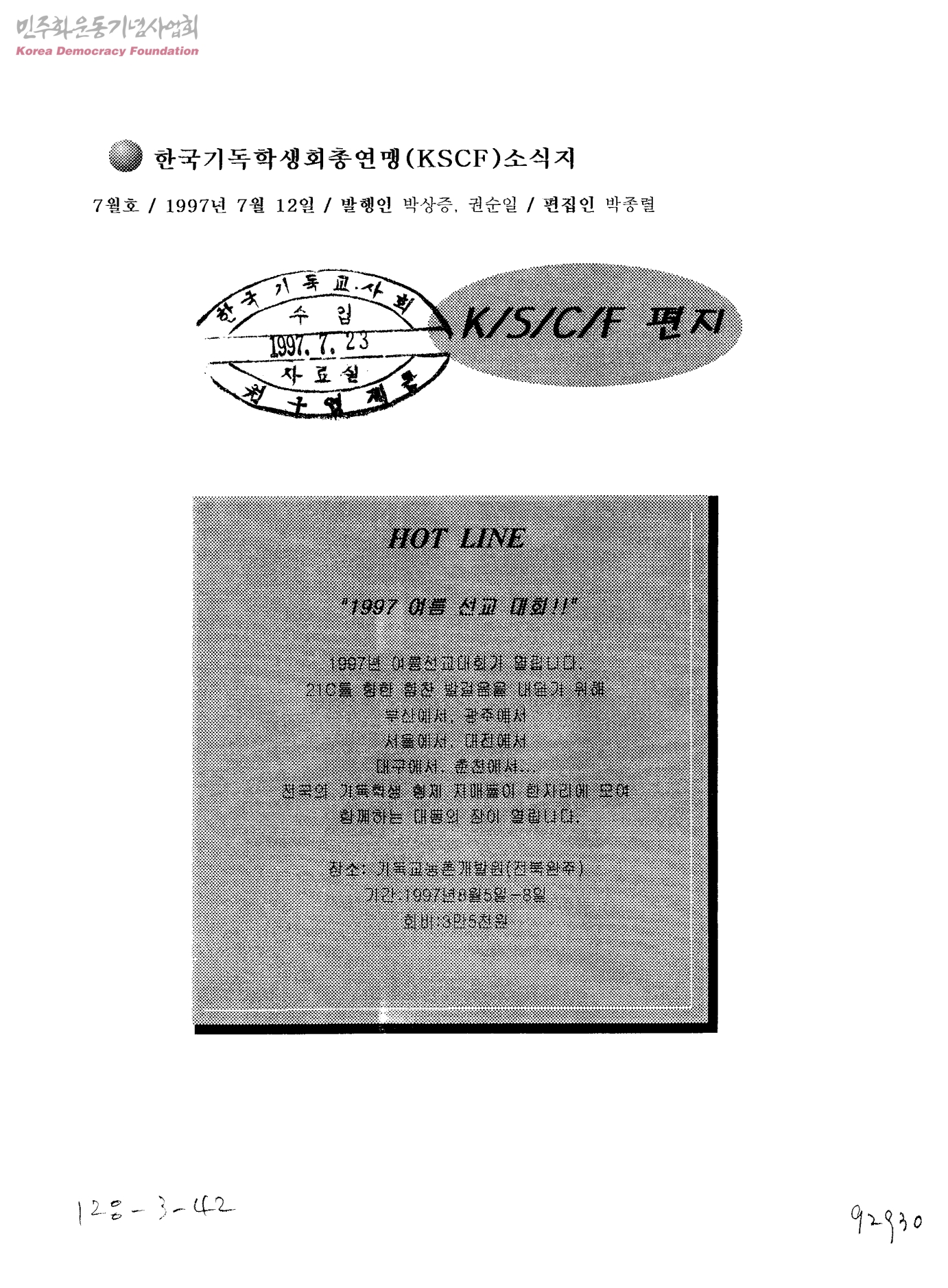한국기독학생회총연맹(KSCF)소식지 7월호 K/S/C/F 편지
