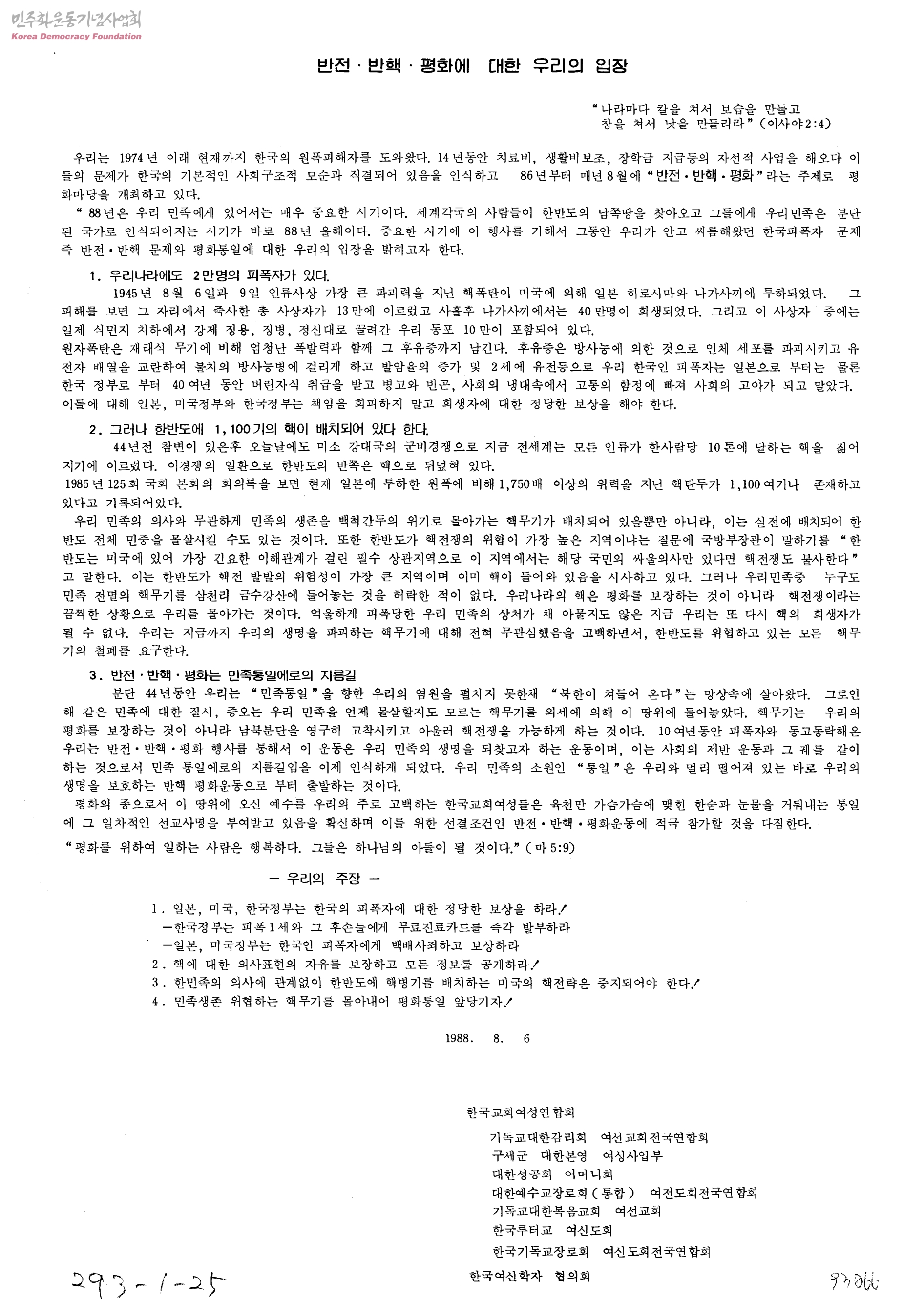 - 한국교회여성연합회,기독교대한감리회여선교회전국연합회, 구세군대한본영여성사업부, 대한성공회어머니회, 대한예수교장로회(통합)여전도회전국연합회, 기독교대한복음교회여선교회, 한국루터교여신도회, 한국기독교장로회여신도회전국연합회, 한국여신학자협의회