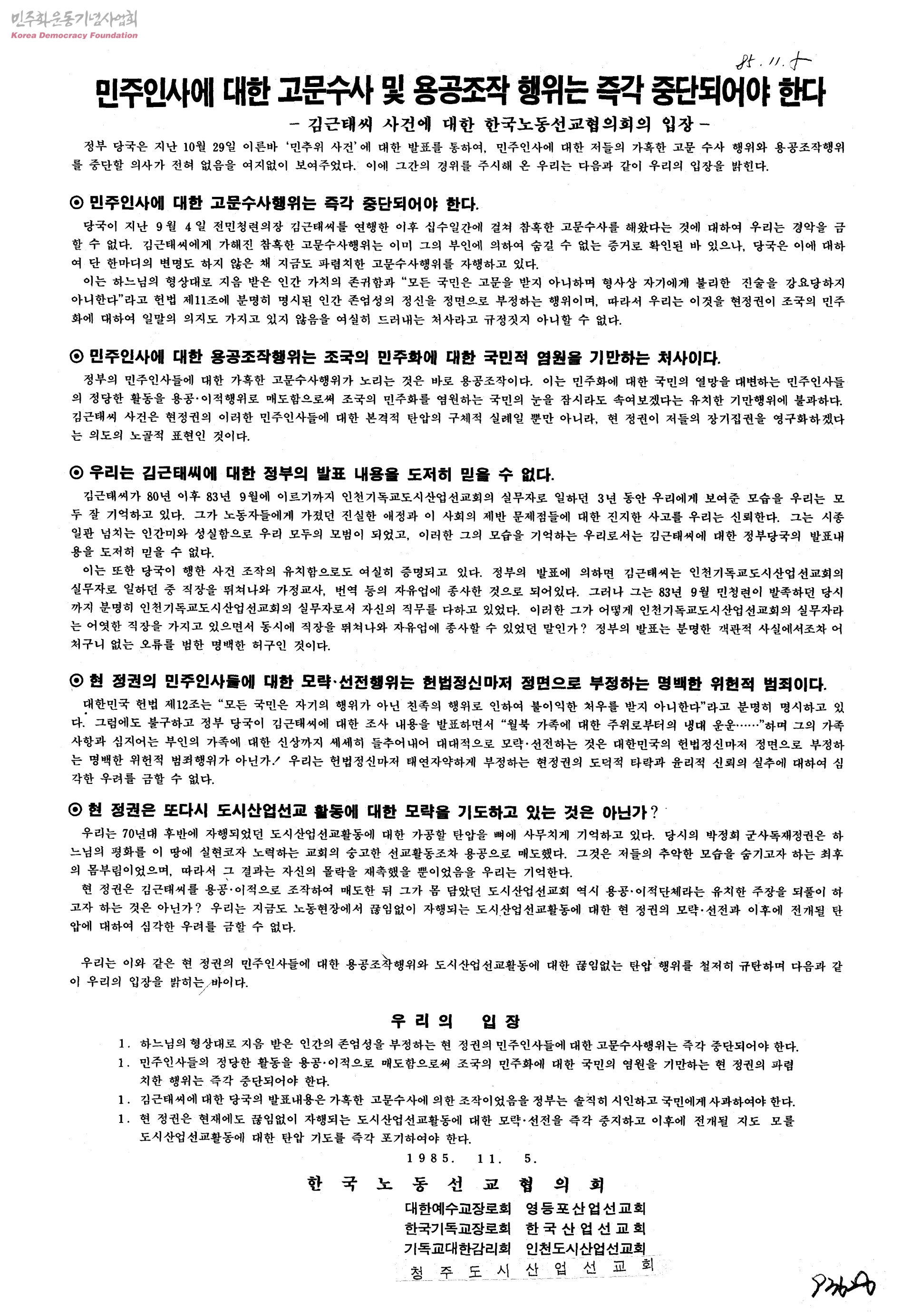민주인사에 대한 고문수사 및 용공조작 행위는 즉각 중단되어야 한다-김근태씨 사건에 대한 한국노동선교협의회의 입장