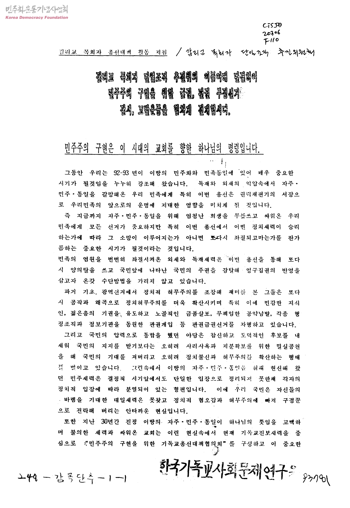 감리교 목회자 총선대책 활동 지침_감리교 목회자 단일조직 추진위의 이름아래 단결하여 민주주의 구현을 위한 금권, 관권 부정선거 감시, 고발운동을 힘차게 전개합시다