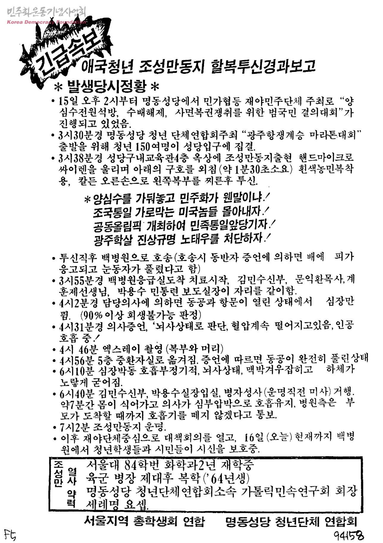 긴급속보-애국청년 조성만동지 할복투신경과보고