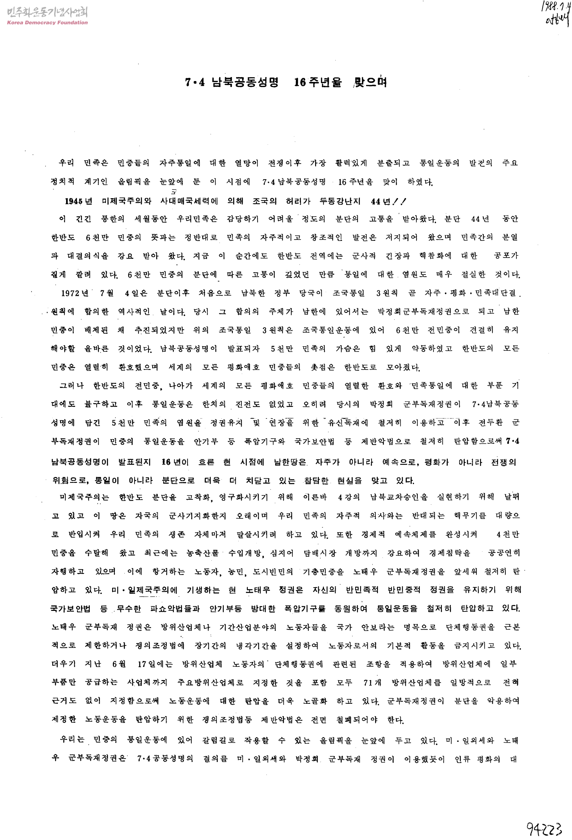 7.4 남북공동성명 16주년을 맞으며