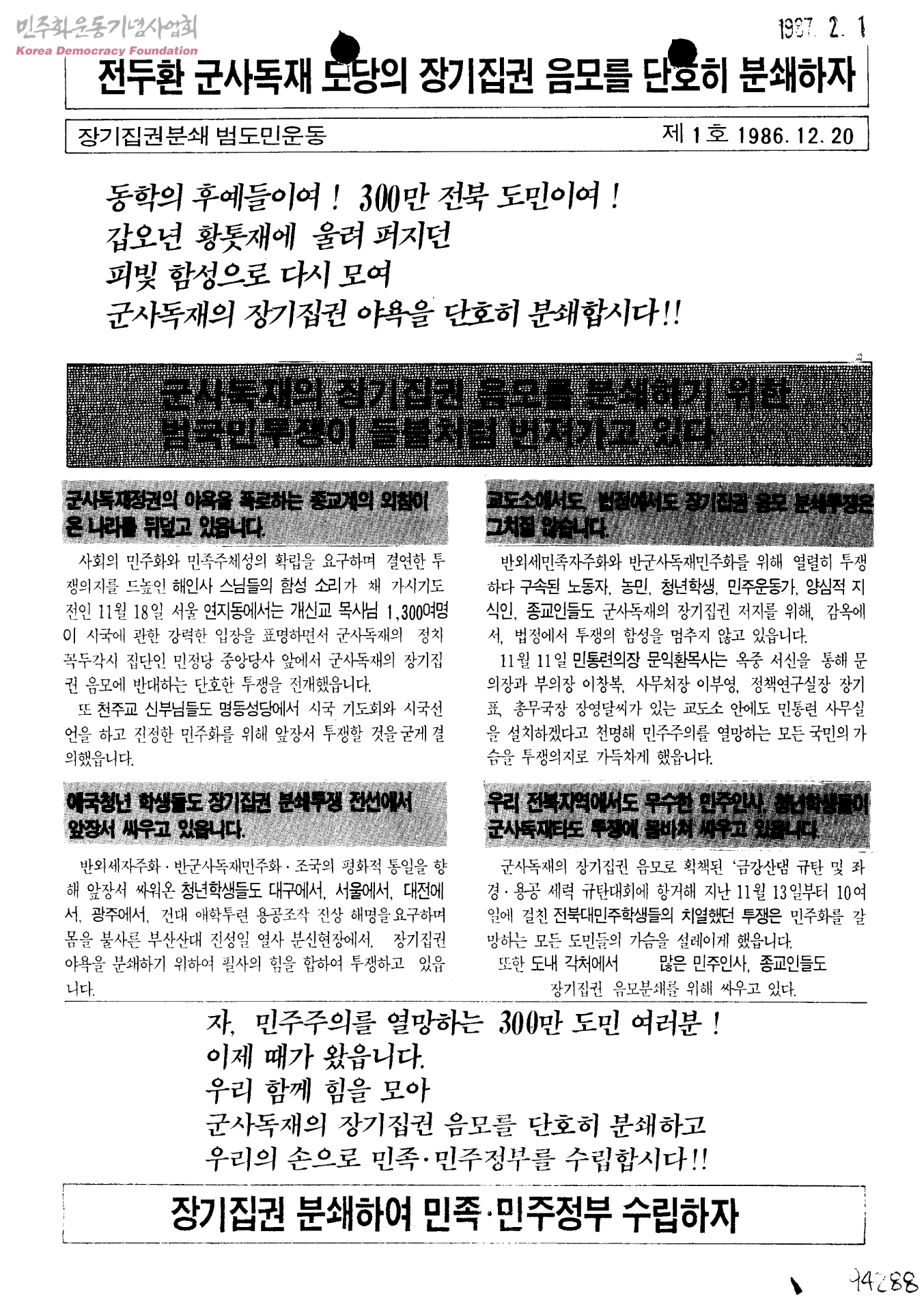 전두환 군사독재 도당의 장기집권 음모를 단호히 분쇄하자- 장기집권분쇄 범도민운동 제1호