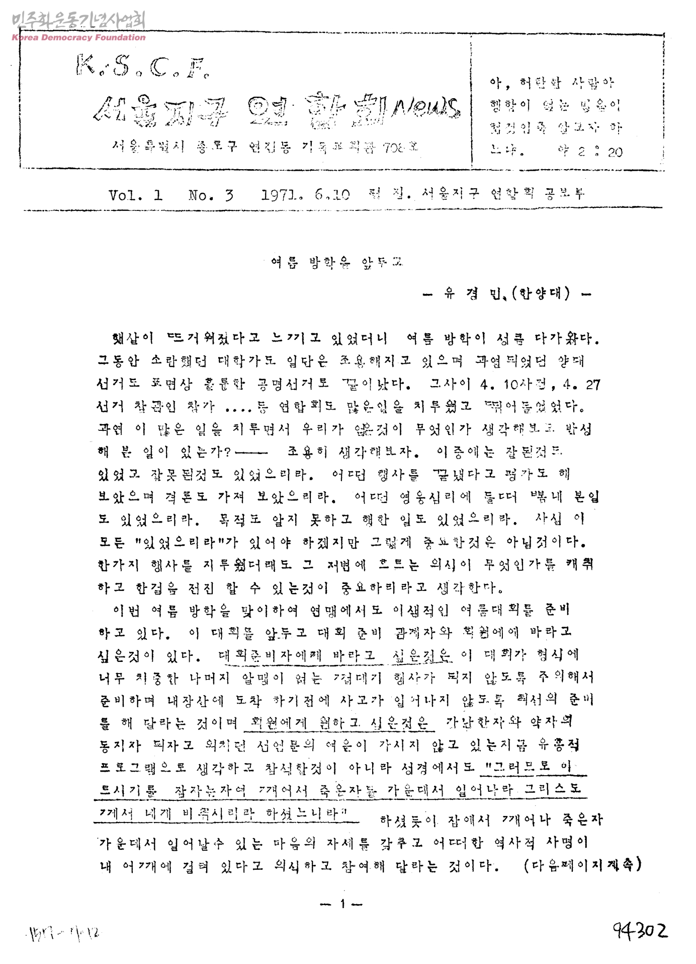 K.S.C.F. 서울지구 연합회 NEWS(Vol.1 No.3)