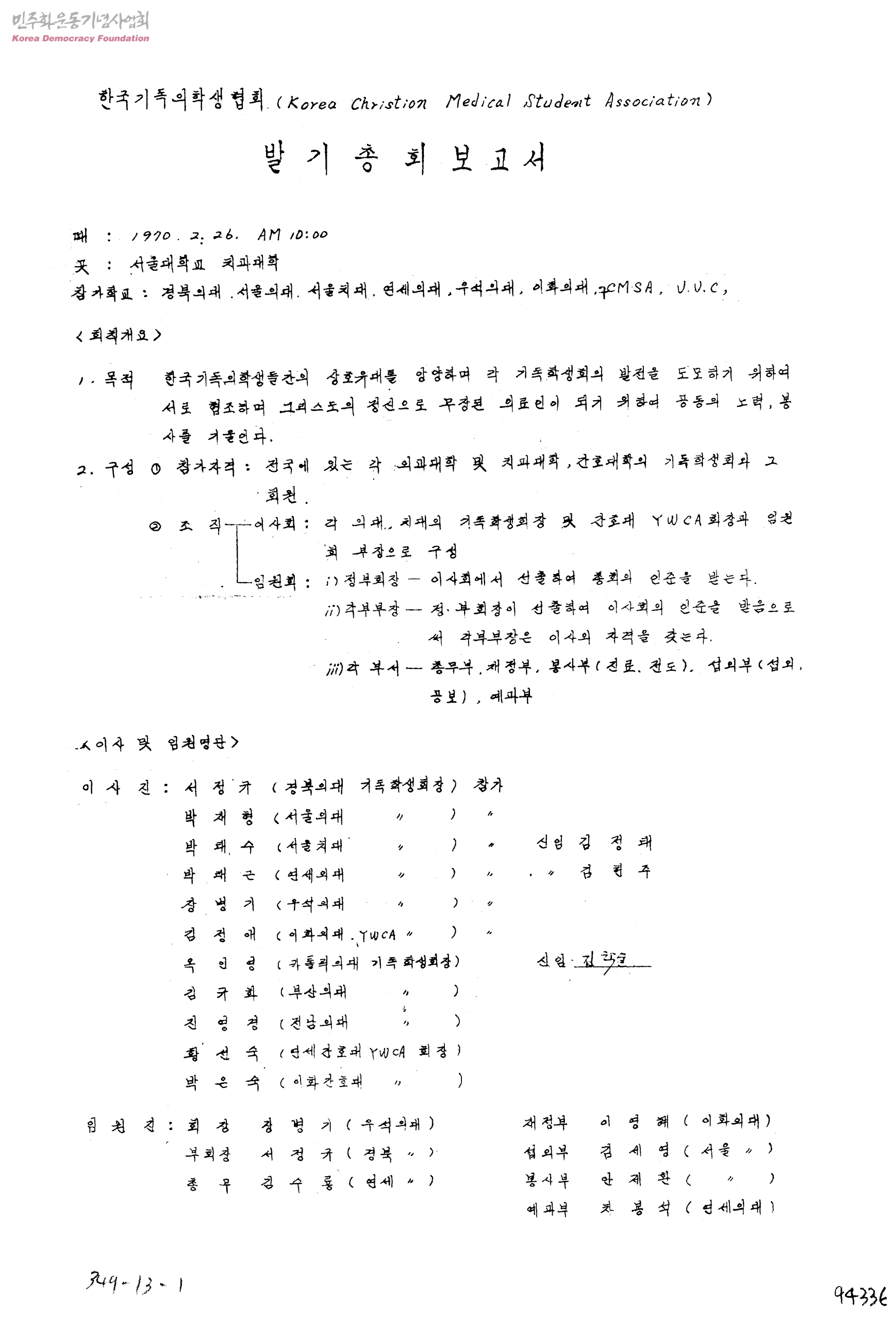 한국기독의학생협회 발기총회보고서