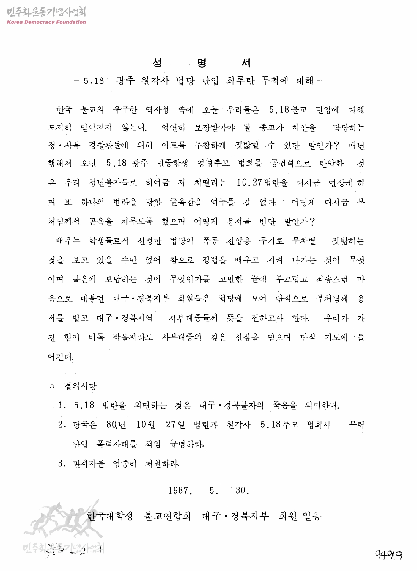 성명서-5ㆍ18 광주 원각사 법당 난입 최루탄 투척에 대해