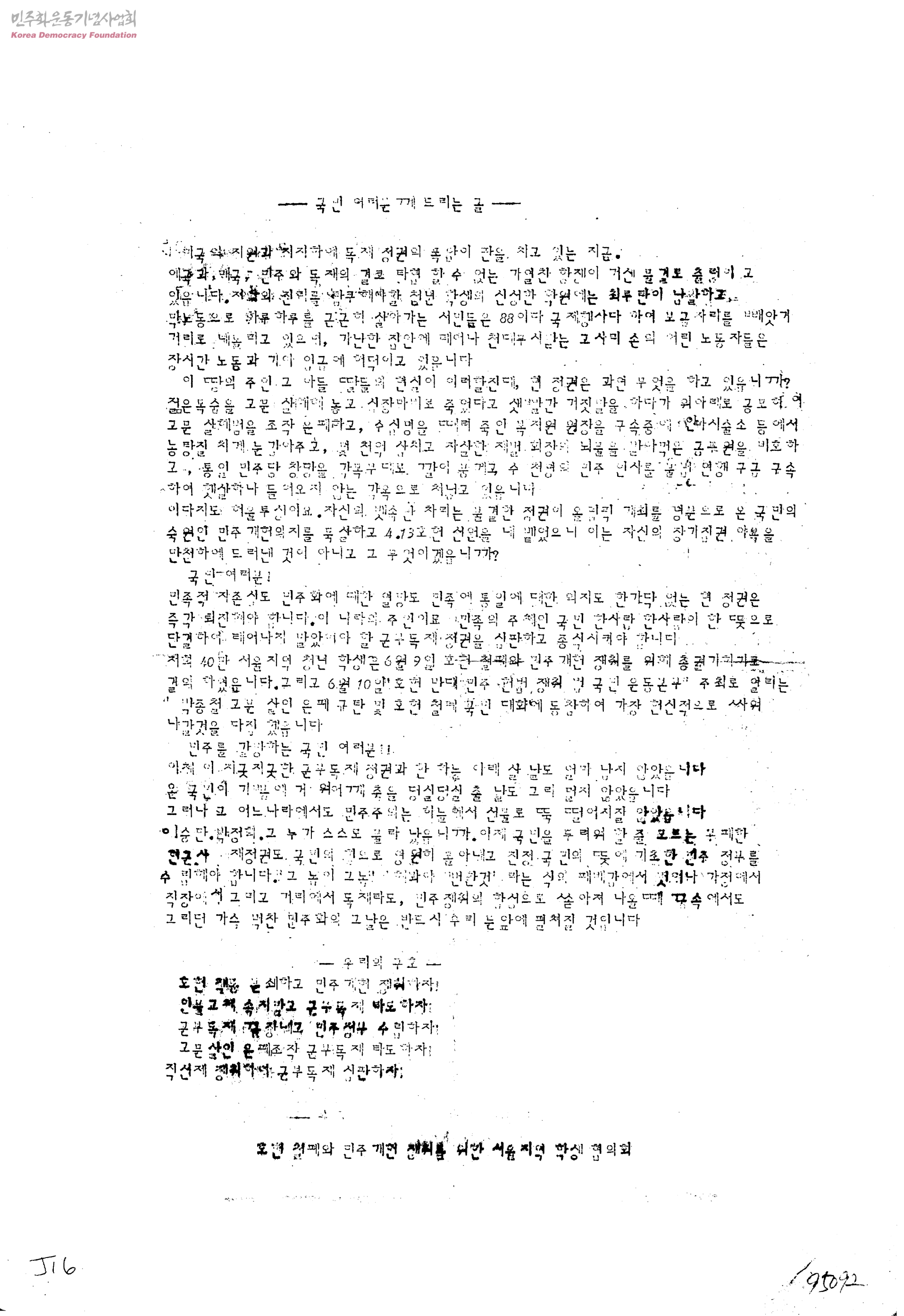 국민 여러분께 드리는 글[호헌철폐와 군부독재타도 관련]