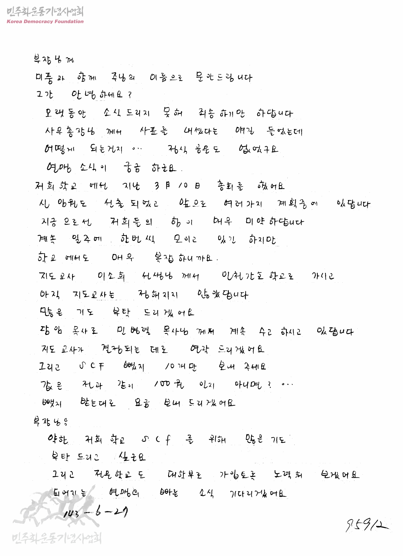 [김정희가 이직형부장(한국기독학생회총연맹)에게 보내는 신규임원명단 관련 편지]