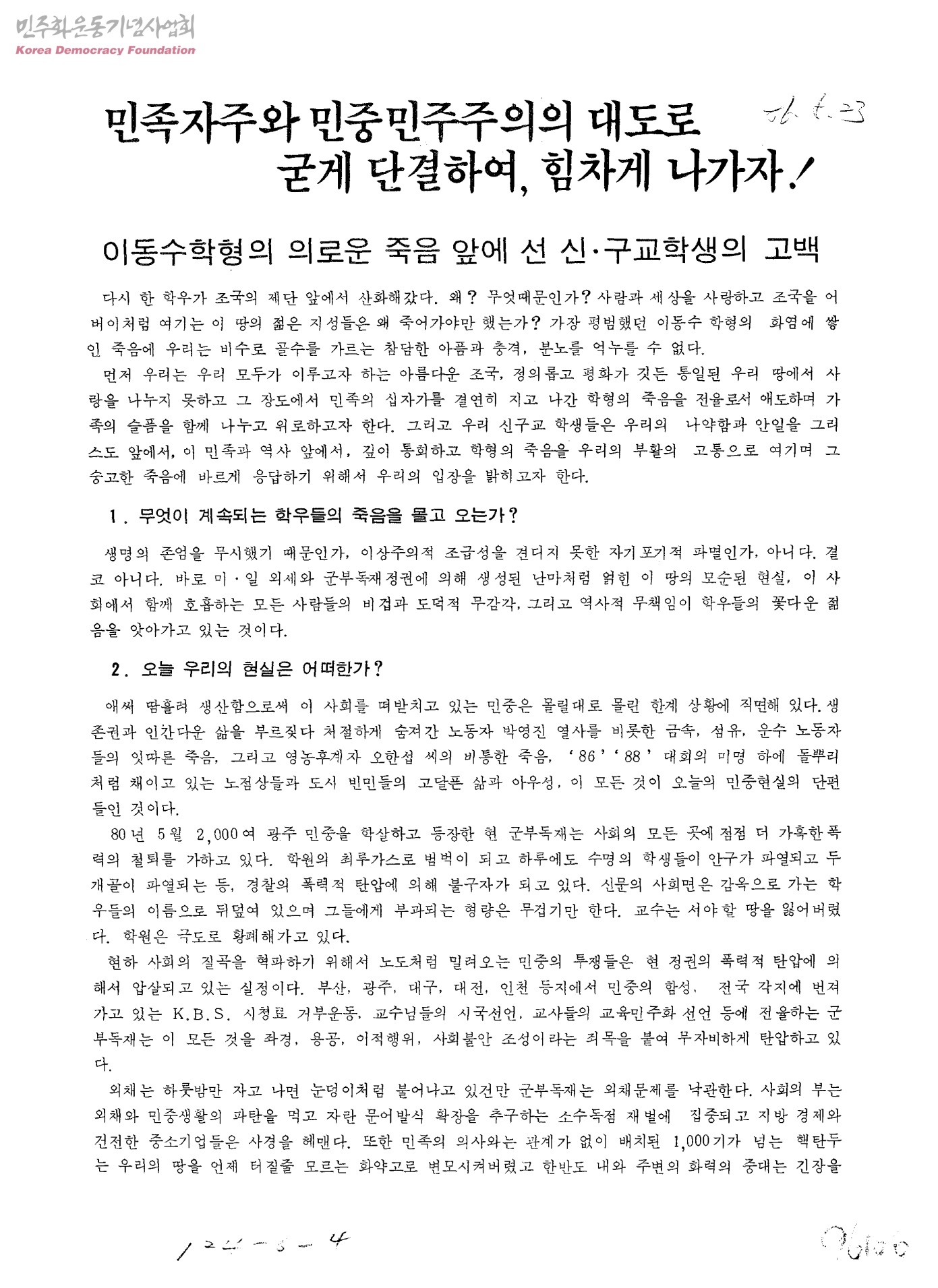 이동수학형의 의로운 죽음 앞에 선 신ㆍ구교학생의 고백[민족자주와 민중민주주의의 대도로 굳게 단결하여, 힘차가 나가자!]