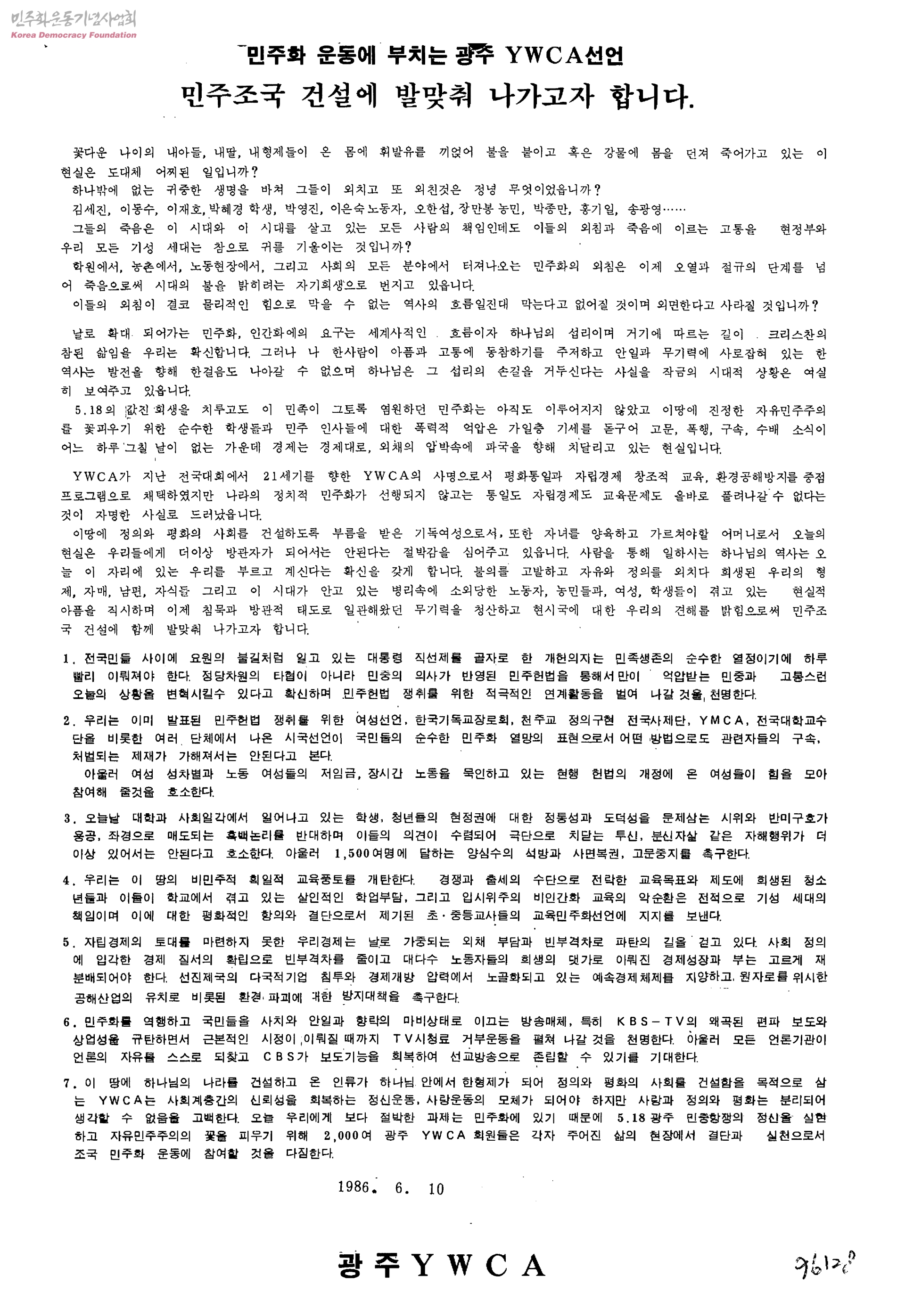 민주화 운동에 부치는 광주YWCA선언-민주조국 건설에 발맞춰 나가고자 합니다