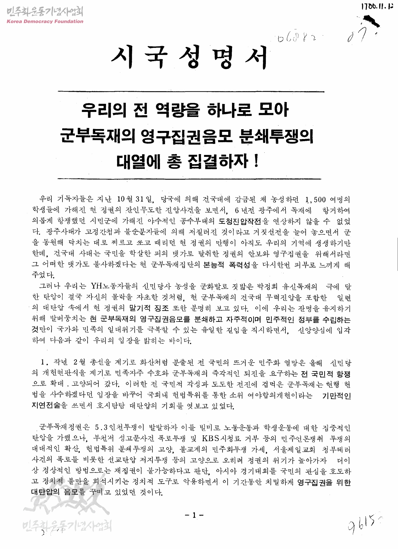 시국성명서-우리의 전 역량을 하나로 모아 군부독재의 영구집권음모 분쇄투쟁의 대열에 총 집결하자!