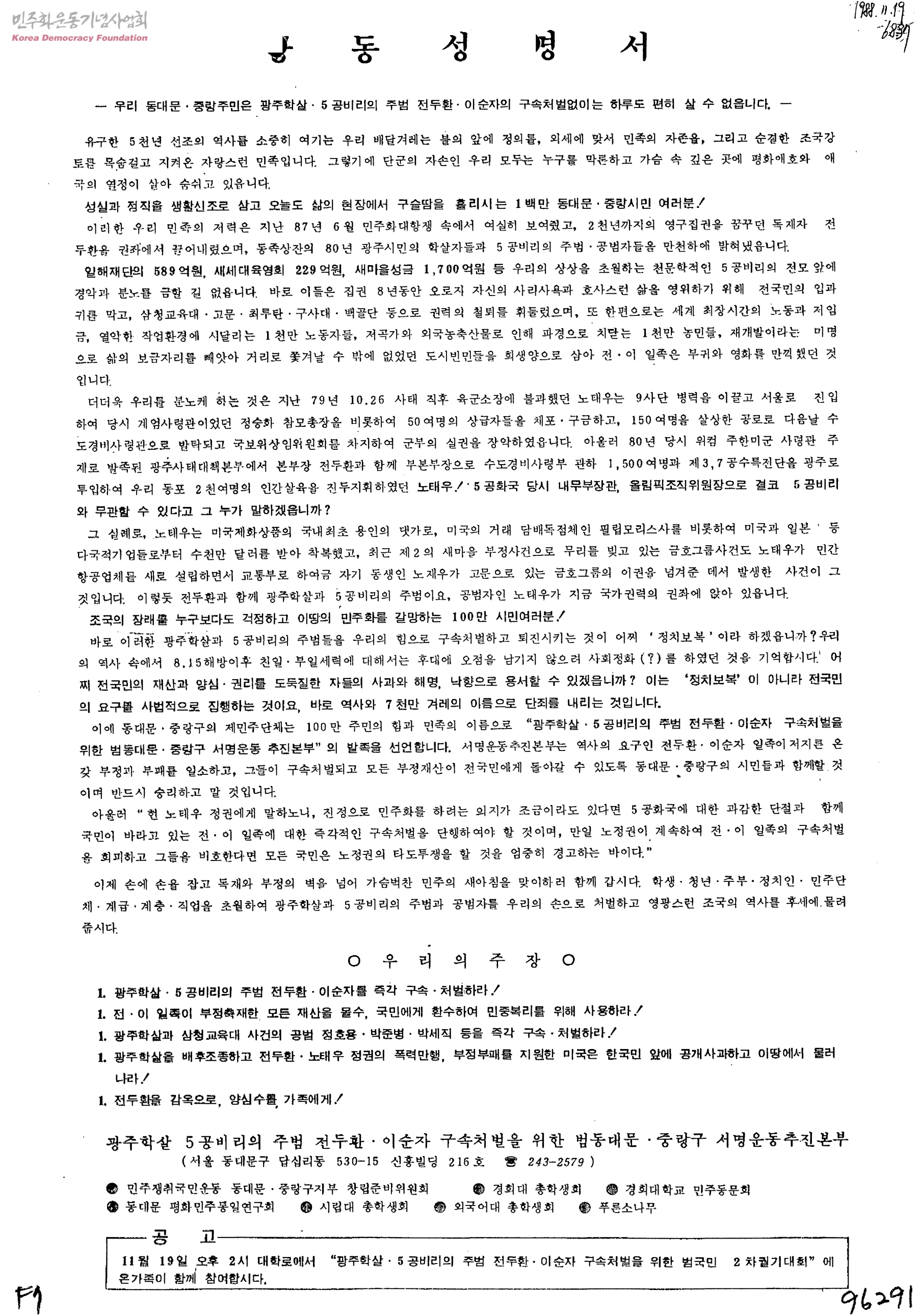 공동성명서-우리 동대문,중랑주민은 광주학살, 5공비리의 주범 전두환, 이순자의 구속처벌없이는 하루도 편히 살 수 없읍니다