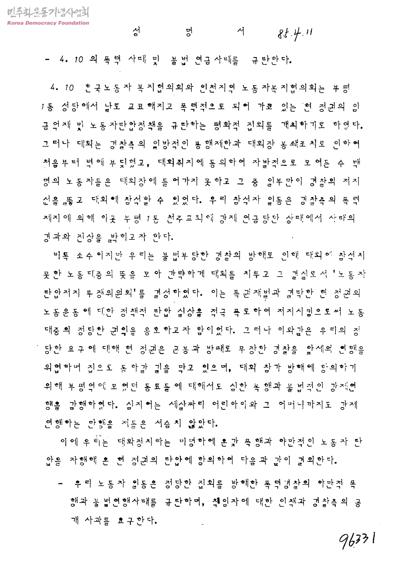 성명서-4.10의 폭력 사태 및 불법 연금사태를 규탄한다
