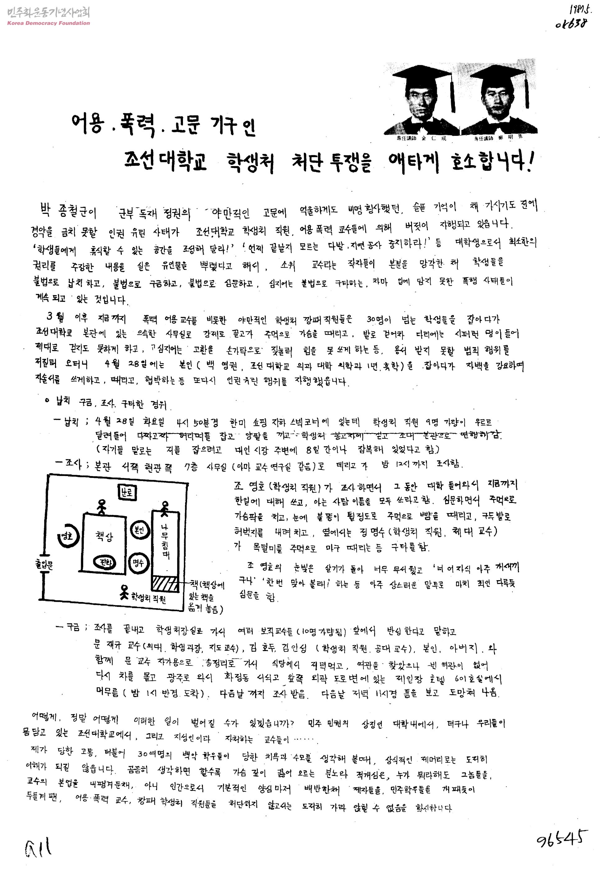 어용. 폭력. 고문 기구인 조선대학교 학생처 처단 투쟁을 애타게 호소합니다