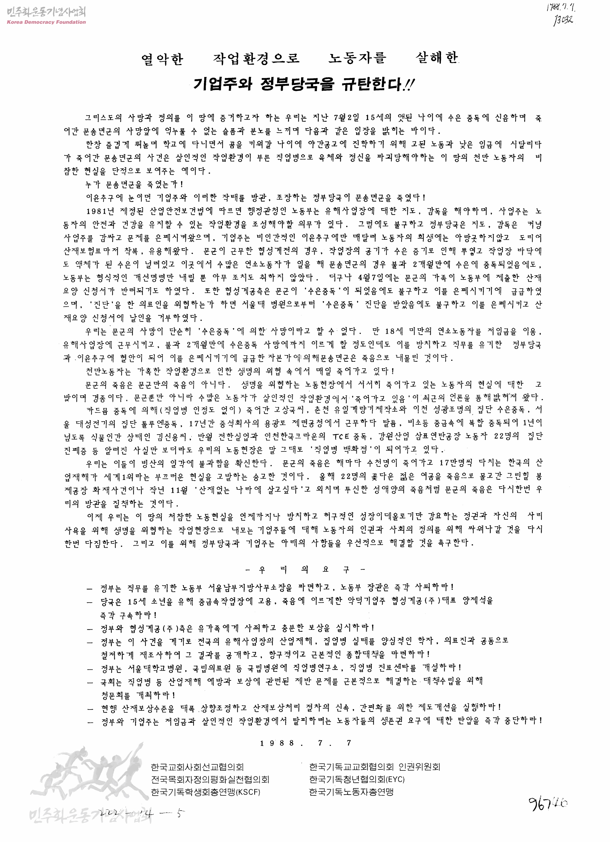 - 한국교회사회선교협의회, 한국기독교교회협의회 인권위원회, 전국목회자정의평화실천협의회, 한국기독청년협의회, 한국기독학생회총연맹, 한국기독노동자총연맹