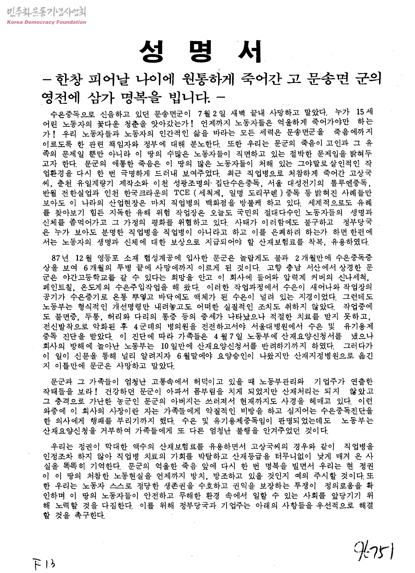 성명서-한창 피어날 나이에 원통하게 죽어간 고 문송면 군의 영전에 삼가 명복을 빕니다.