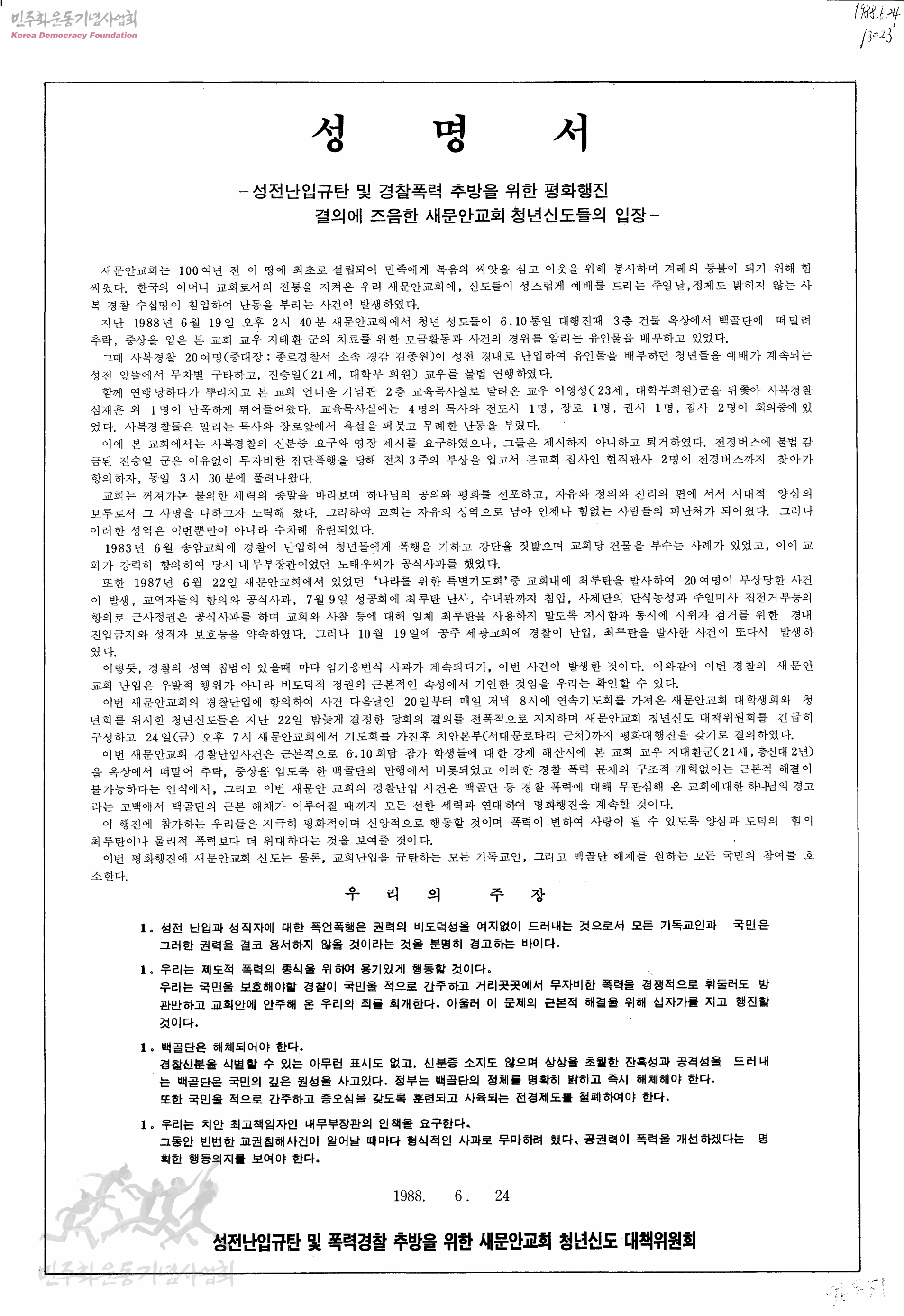 성명서_성전난입규탄 및 경찰폭력의 추방을 위한 평화행진결의에 즈음한 새문안교회 청년신도들의 입장