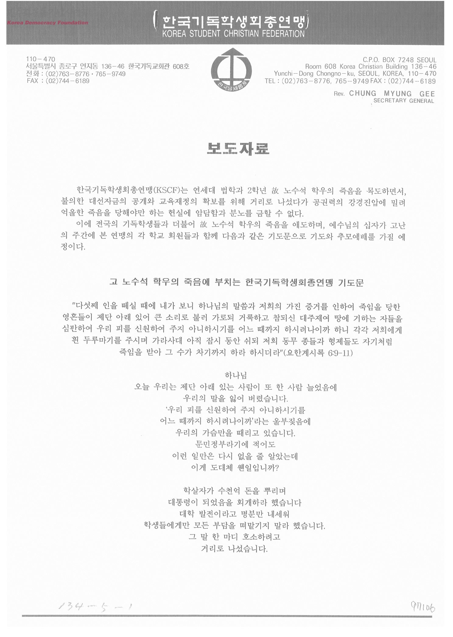 고 노수석 학우의 죽음에 부치는 한국기독학생회총연맹 기도문
