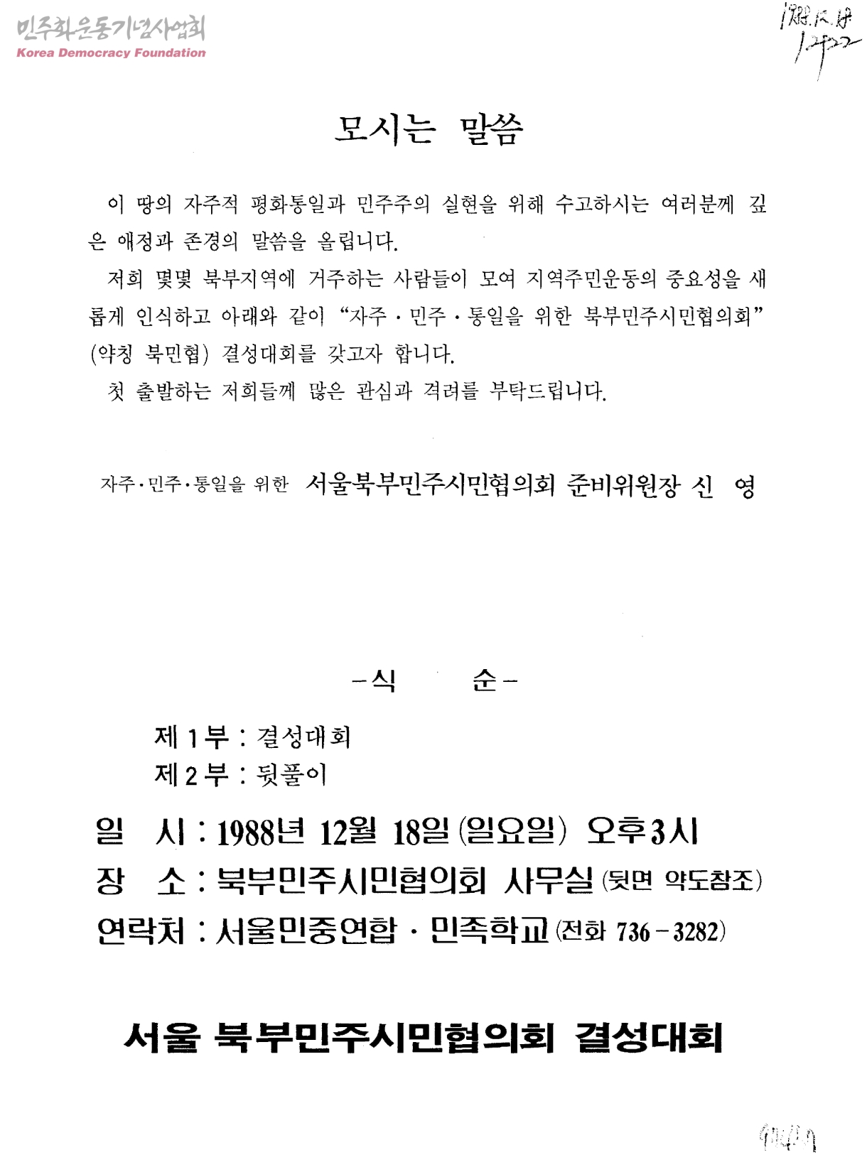 자주ㆍ민주ㆍ통일을 위한 북부민주시민협의회결성대회 초청장