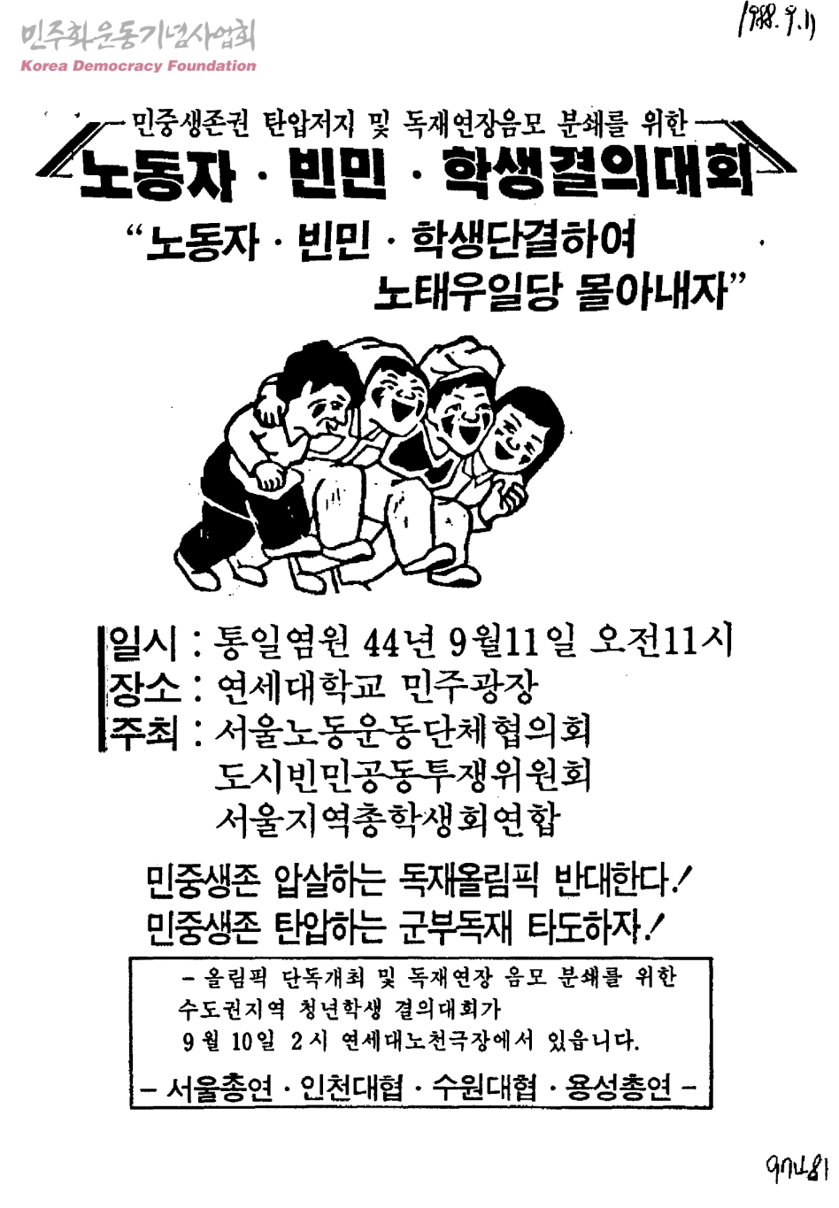 민중생존권 탄압저지 및 독재연장음모 분쇄를 위한 노동자ㆍ빈민ㆍ학생결의대회-노동자ㆍ빈민ㆍ학생단결하여 노태우일당 몰아내자