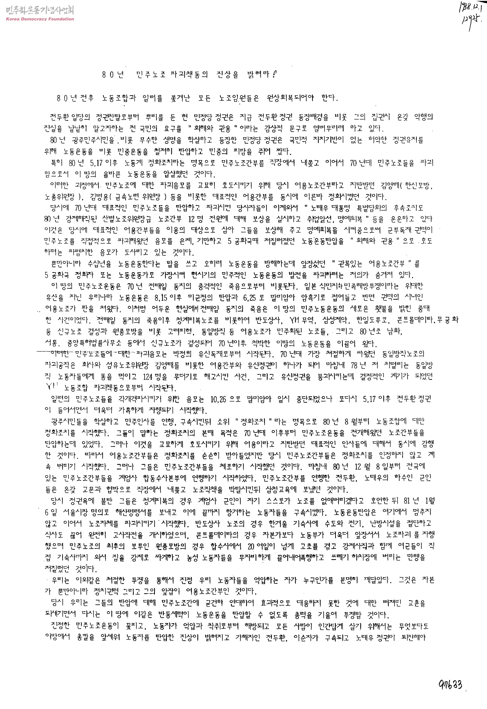 80년 민주노조 파괴책동의 진상을 밝혀라!_80년전후 노동조합과 일터를 쫓겨난 모든 노조임원들은 원상회복되어야 한다.