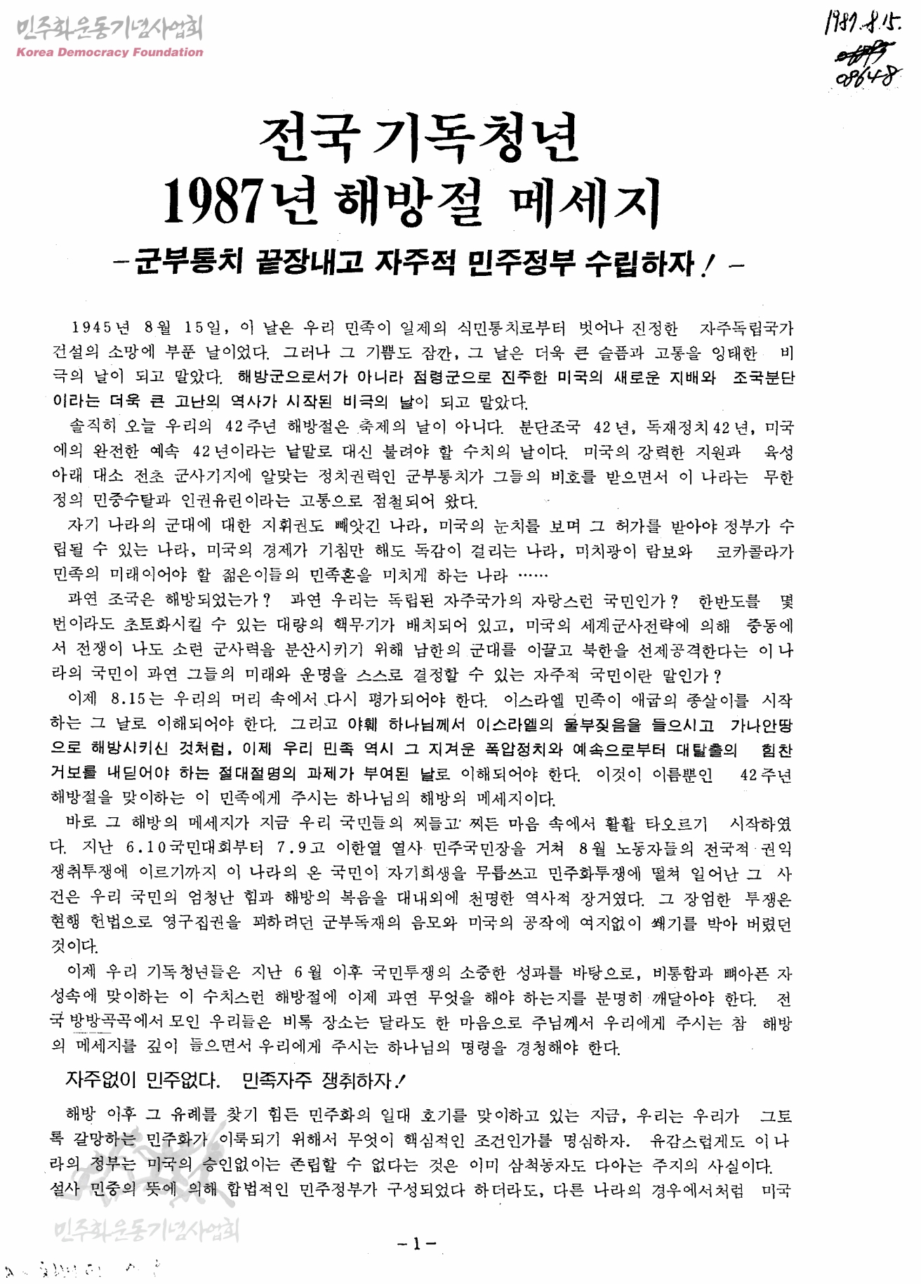 전국 기독청년 1987년 해방절 메시지 _군부통치 끝장내고 자주적 민주정부 수립하자!_