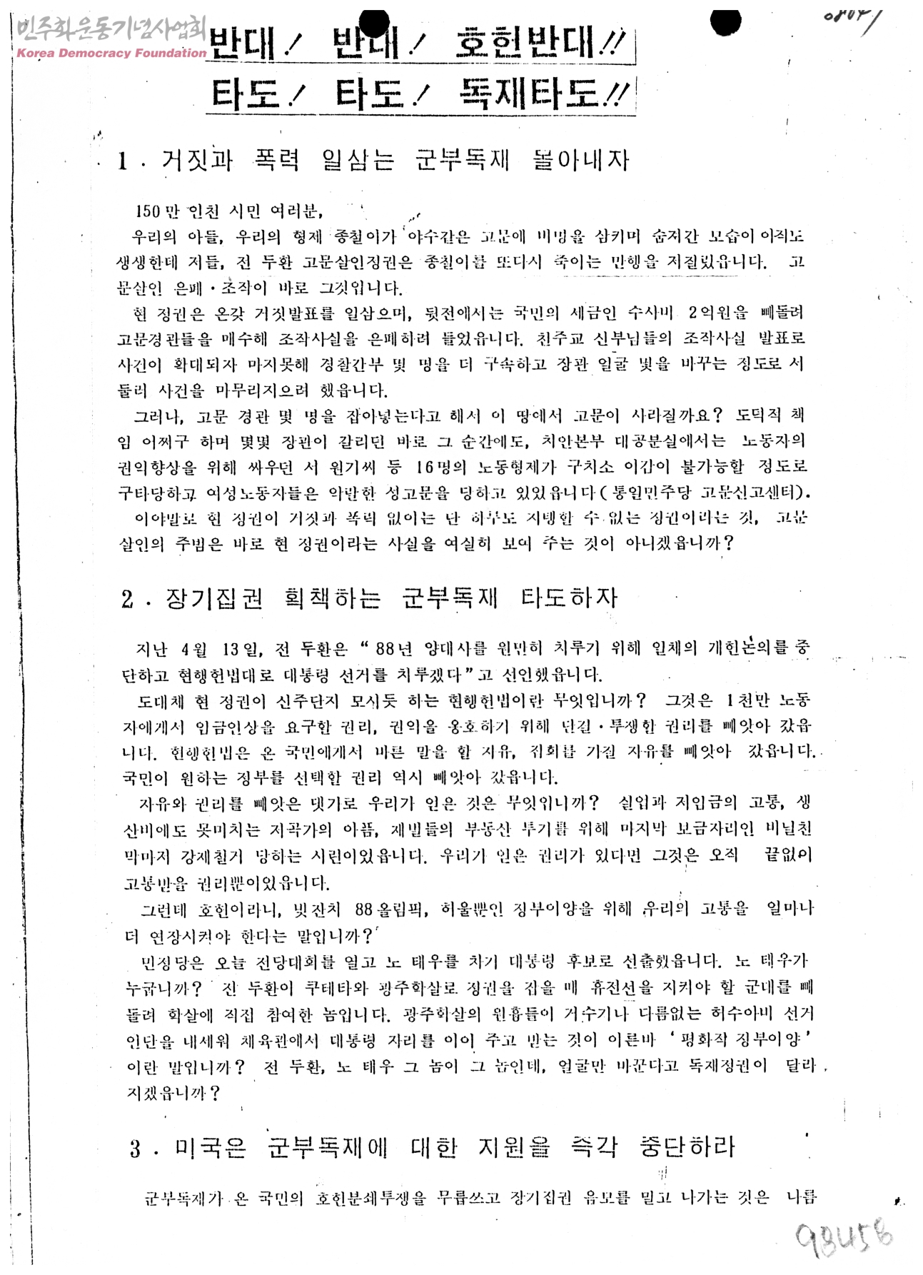 반대! 반대! 호헌반대! 타도! 타도! 독재타도!