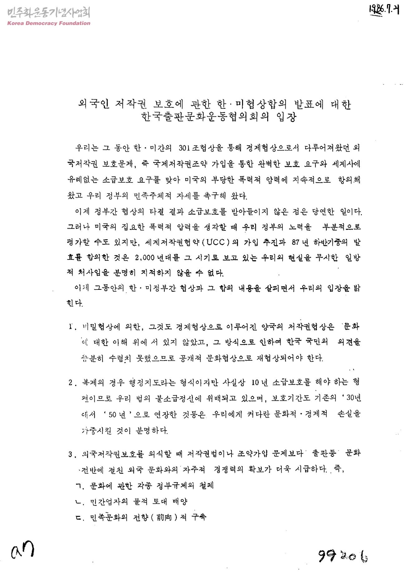외국인 저작권 보호에 관한 한ㆍ미협상합의 발표에 대한 한국출판문화운동협의회의 입장