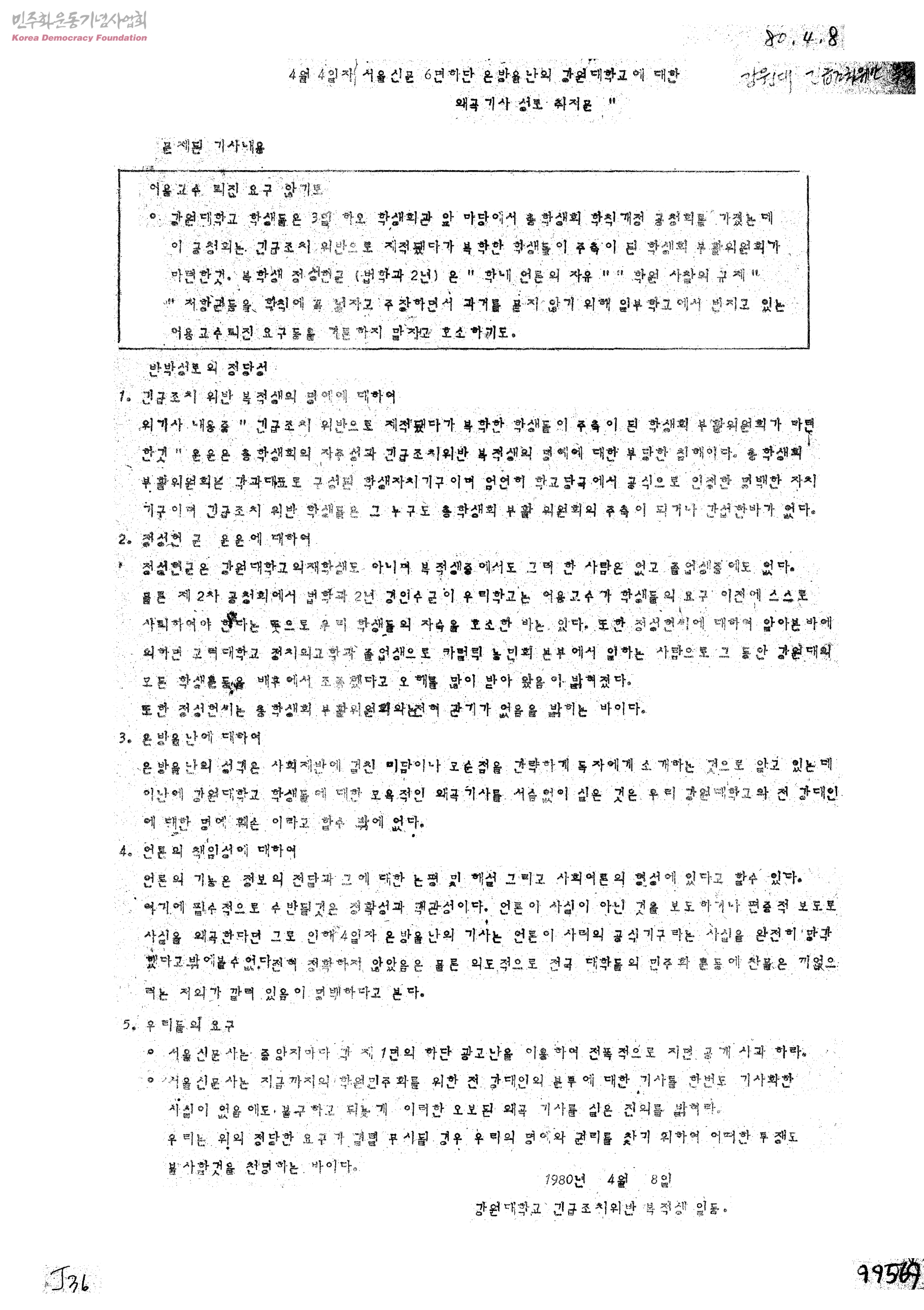 4월4일자 서울신문 6면 하단 은방울난의 강원대학교에 대한 왜곡기사 성토 취지문