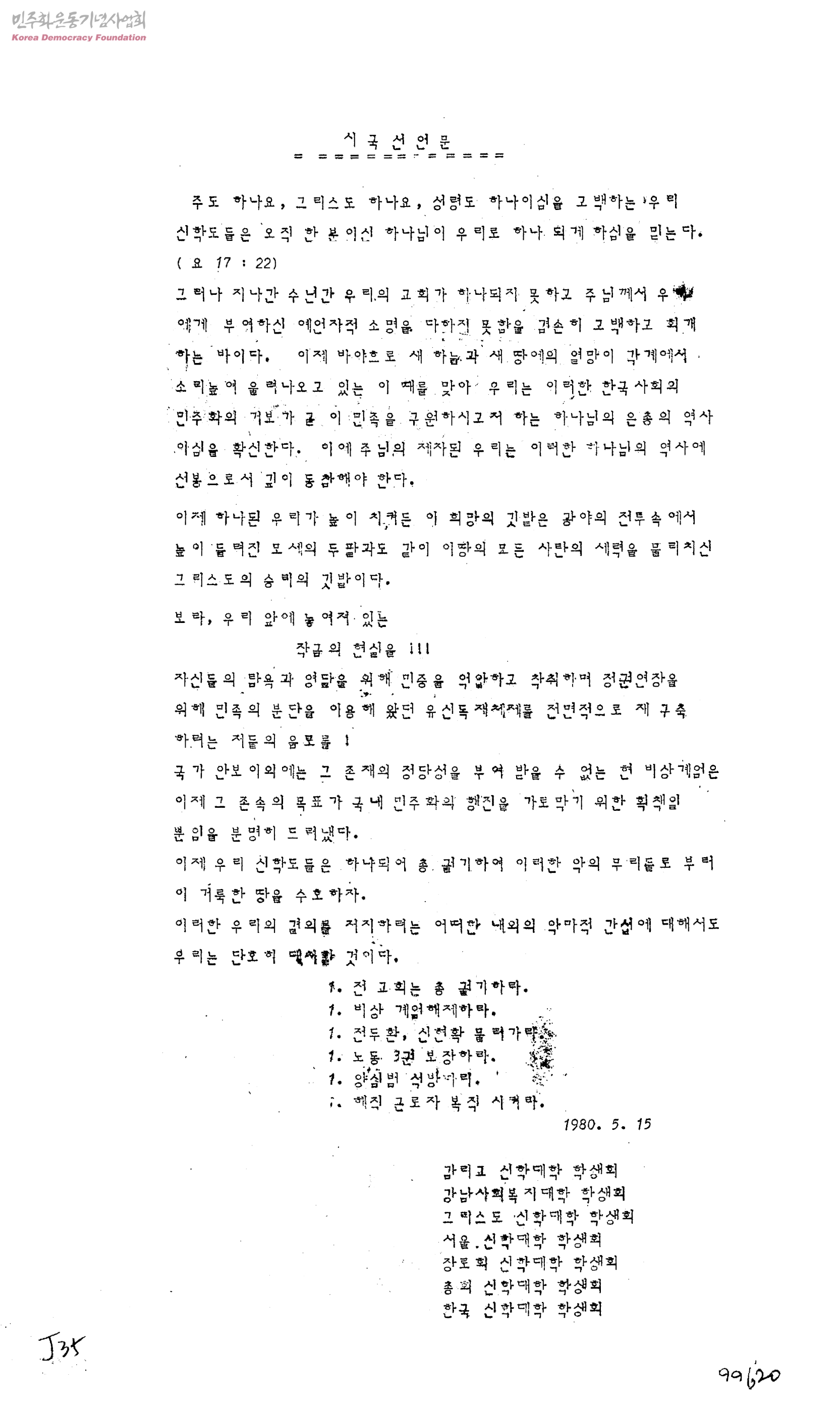 - 감리교신학대학학생회, 강남사회복지대학학생회, 그리스도신학대학학생회, 서울.신학대학학생회, 장로회신학대학학생회, 총회신학대학학생회, 한국신학대학학생회