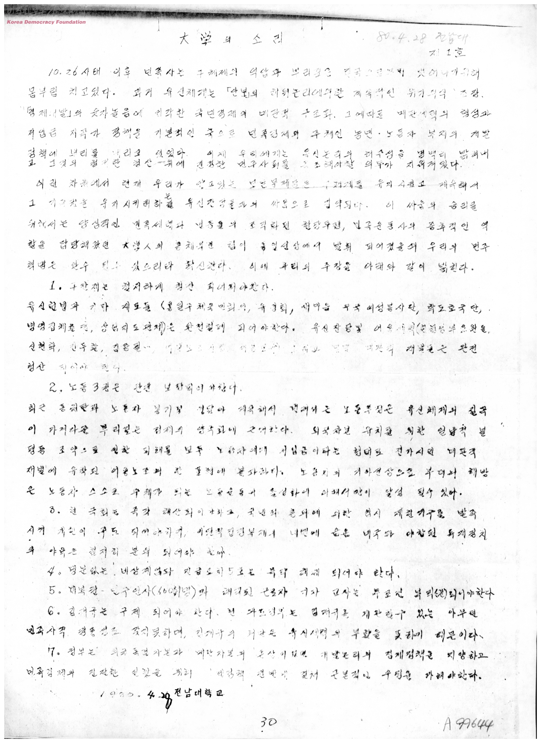 - 1. 구 잔재는 철저하게 청산 되어져야한다. 2. 노동3권은 완전 보장되어야한다. 3. 현 국회는 즉각 해산되어야한다 등...