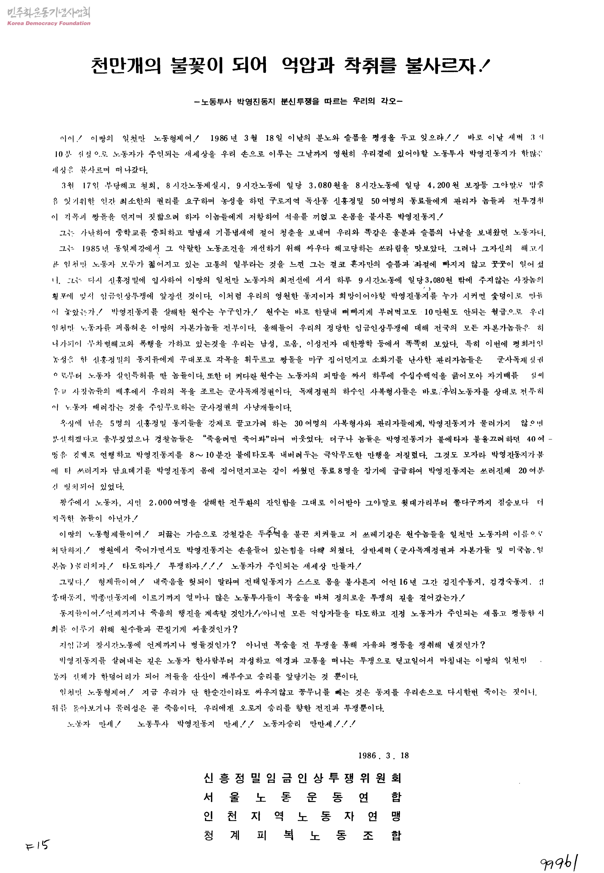 천만개의 불꽃이 되어 억압과 착취를 불사르자!-노동투사 박영신동지 분신투쟁을 따르는 우리의 각오