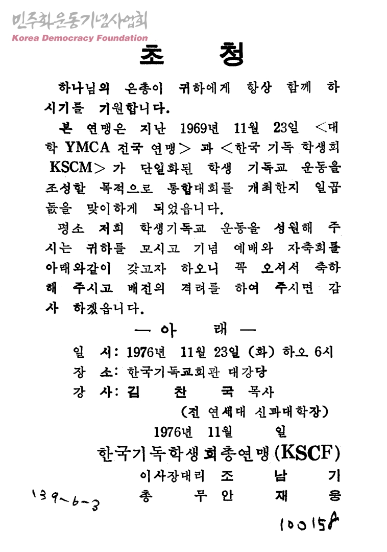 초청장[대학 YMCA 전국연맹과 한국기독학생회KSCM 통합대회 7주년 기념회]
